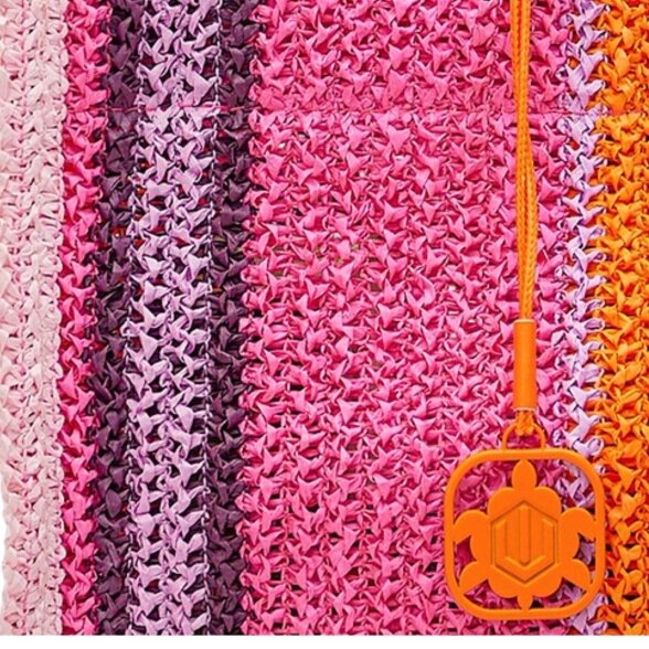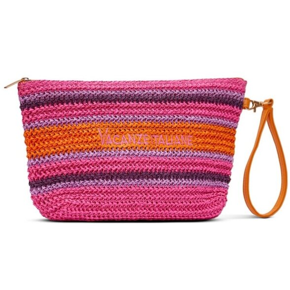 Compacte pouch strandtas van Vacanze in Pink met oranje en paarse strepen. Gehaakt vlechtwerk met voelbare textuur. Ritssluiting boven, polsband rechts bevestigd. Logo VACANZE ITALIANE op de voorkant. Praktisch strand accessoire en polstas binnen je Accessoires collectie, ook als clutch. Vacanze WONDERY pouch strandtas
