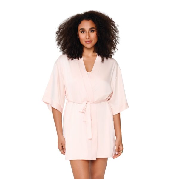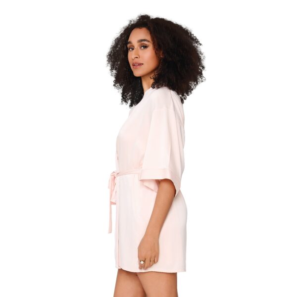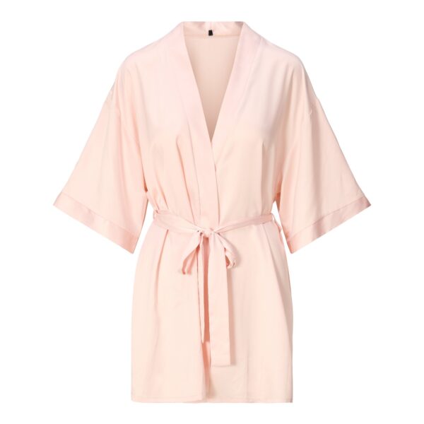 Deze korte badjas van LingaDore DAILY in de kleur huid is gemaakt van satijn en heeft een gladde, zachte structuur. Het model beschikt over een v-hals en korte kimonomouwen. De badjas sluit met een bindceintuur die aan de voorkant gestrikt wordt. De lichte huidskleur geeft een zachte, neutrale uitstraling. Het satijn voelt comfortabel aan op de huid en draagt lekker luchtig.