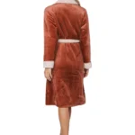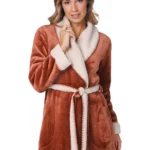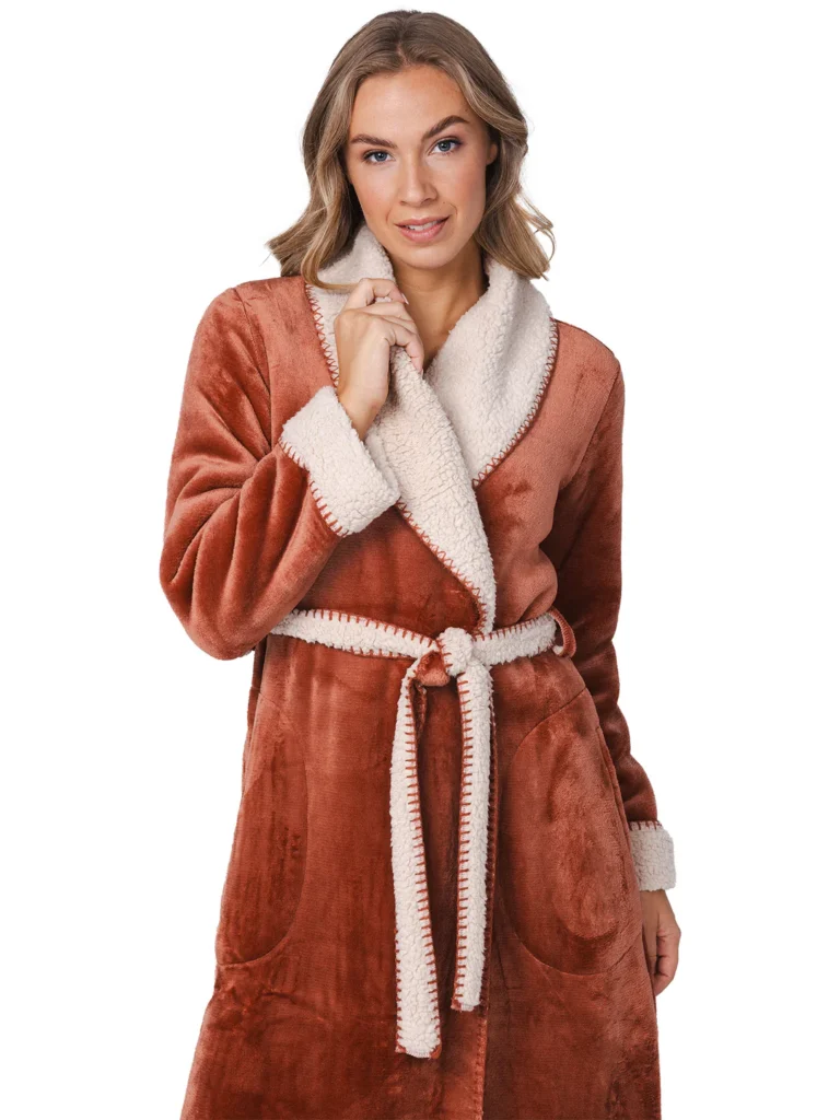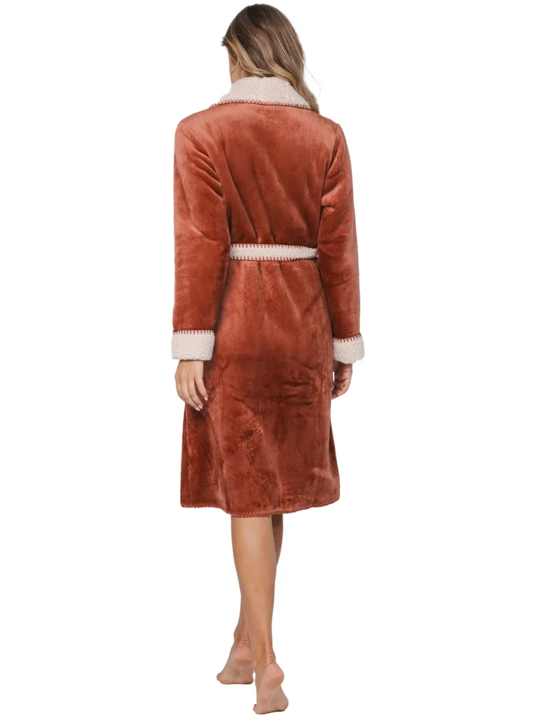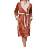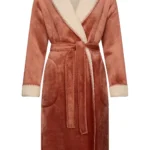Deze heerlijk zachte en warme badjas komt uit de serie Eternal van Pastunette Premium. De badjas is terra bruin van kleur en heeft lange mouwen en twee zakken aan de voorkant. Het is een overslagmodel met een grote sjaalkraag, zodat je er heerlijk in kunt wegkruipen op koude dagen. Leuk detail is de ceintuur in de taille en de beige afwerking in een zachte teddy stof langs de mouwen en hals.