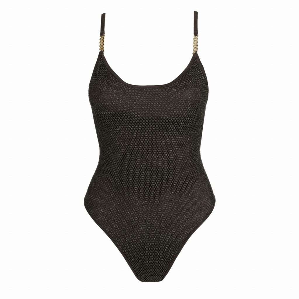 Ontdek het SardaSwim JANJA badpak uitneembare pad badpak voorgevormd in de kleur bruin. Dit badpak voorgevormd heeft een subtiele glinsterende structuur die zorgt voor een elegante uitstraling. De rechte schouderbandjes zijn aan de voorzijde verrijkt met goudkleurige kettingdetails. Dankzij de uitneembare pads bepaal jij zelf de gewenste vorm en ondersteuning. Met deze badmode met glitter kies je voor kwaliteit en een stijlvolle look aan het water.