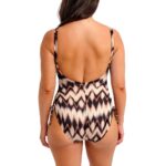 Het Fantasie SABANA incaprint v-neck badpak met beugel is een stijlvolle keuze voor zonnige dagen. Dit badpak is uitgevoerd in de basiskleur ZWART en is voorzien van een levendige zigzagprint in warme aardetinten. Het model beschikt over een elegante V-hals en een subtiel geplooid detail tussen de cups, wat zorgt voor een mooie vorm. De ingewerkte beugel biedt de ondersteuning die je gewend bent van Fantasie. Aan de zijkanten bevinden zich verstelbare koordjes, waarmee je de beenuitsnijding eenvoudig aanpast aan jouw wensen.