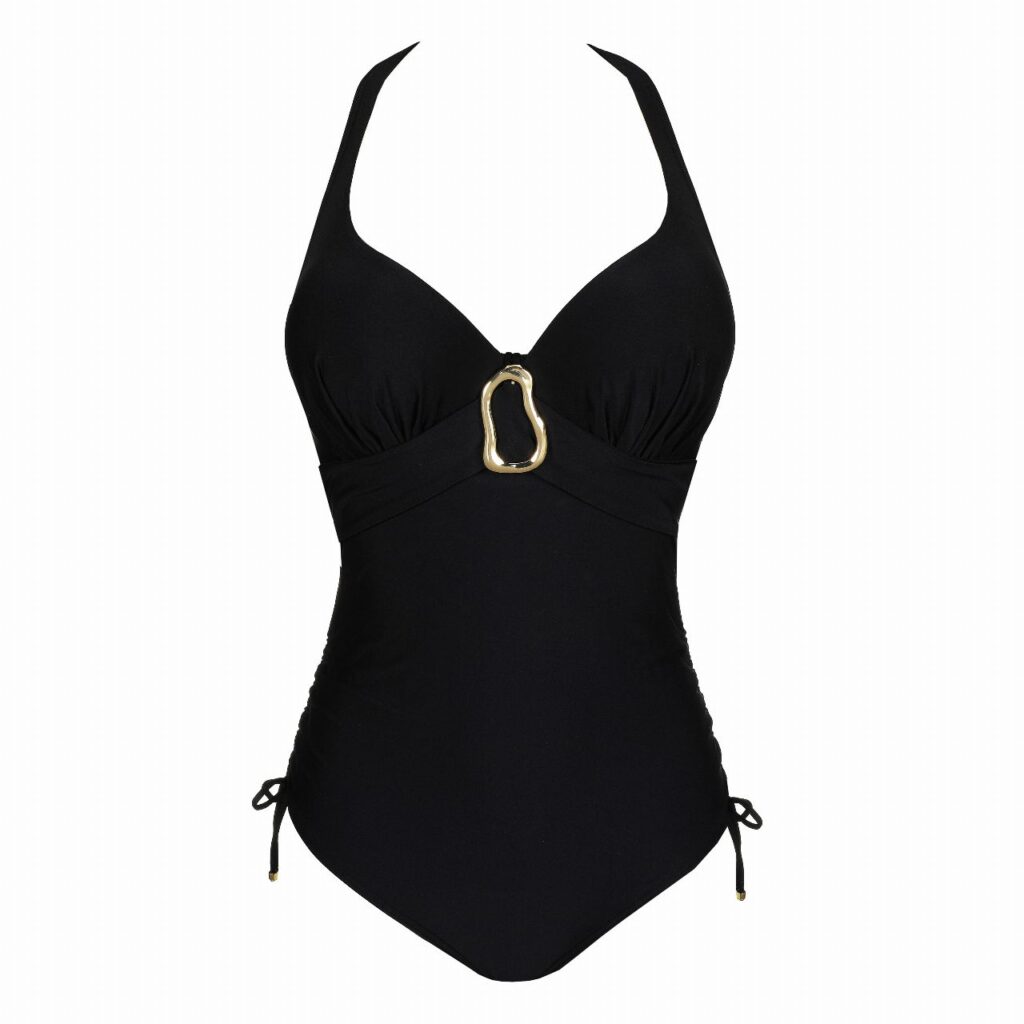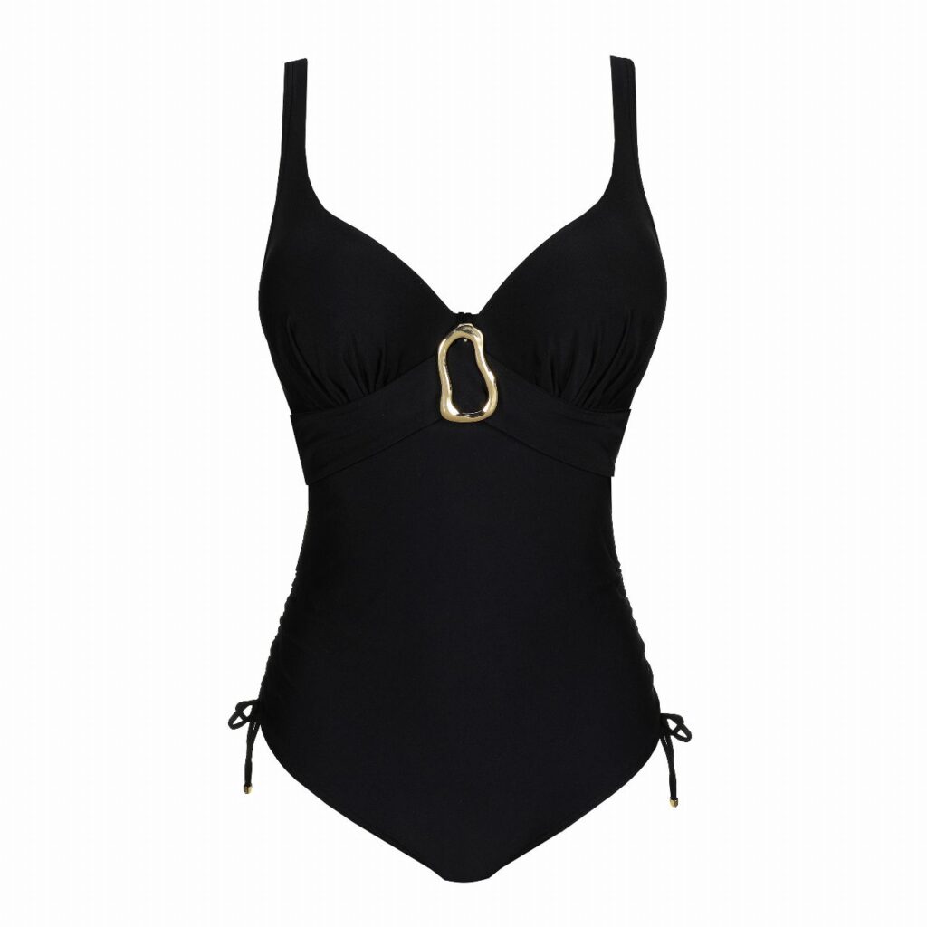 Dit zwarte PrimaDonna Swim UVITA swimsuit deep plunge w badpak voorgevormd heeft een ingebouwde beugel voor een ondersteunende pasvorm. Het badpak met beugel toont een diepe V halslijn met een goudkleurig detail centraal. De gladde stof is geplooid rondom de borsten en taille. Aan de zijkanten zitten verstelbare touwtjes met goudkleurige uiteinden om de beenhoogte aan te passen.