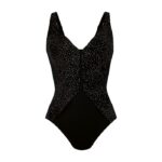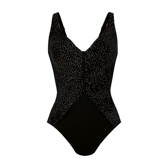 Details: Dit Sabina badpak van Anita is zwart met een wit stipje aan de voorkant. Het elegante badpak is een combinatie van stijl en functionaliteit. De softcups zorgen voor een mooie ronde borstvorm en de elastische stof aan de bovenzijde van de cup, sluit erg fijn aan. Het prachtige diepe decolleté met een smalle ingezette bies en corrigerende plooitjes aan de voorkant creëren een super mooie silhouet. Gemaakt van bedrukte, zeer lichte tule voor een extra verhullend effect. Achterkant van het badpak is van stevig materiaal en effen zwart. De schouderbandjes zijn verstelbaar en de stof sluit rondom de billen. Het perfecte basic badpak, maar net dat beetje extra door de mooi print, flatterende belijning en prachtige stof! Beschikbaar in 2 maten. C cup en E cup. C cup is c/d cup en de E cup is e/f. Ben je wat breder of langer kan je beste de grotere maat pakken.