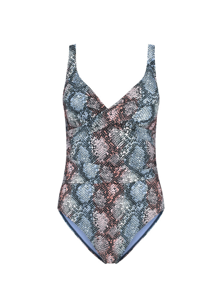 Details: Dit badpak uit de Snake collectie van Beachlife is uitgevoerd in een mooie snake print. Dit nieuwe trendy model badpak heeft lichte padding in de cups, waardoor de borsten een mooie ronde vorm krijgen. De cups zijn uitneembaar en de diepe v-hals creëert een mooi decolleté. Achterkant heeft een gespsluiting met leuke cut out.