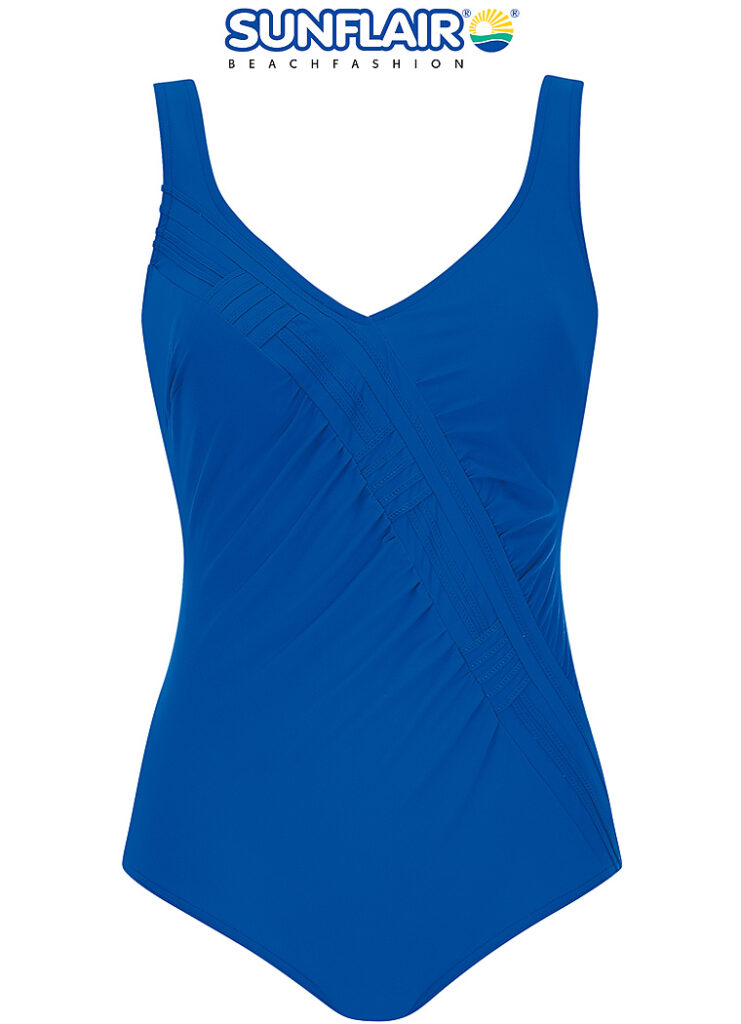 Details: Dit badpak van Sunflair is uitgevoerd in de kleur Kobalt. Een prachtige mooie sprekende kleur blauw. Dit badpak heeft soft-cups die de borsten een mooie ronde vorm geven. De cups sluiten wat hoger op de borst, maar de v-hals geeft een mooie open look. Extra leuk zijn de sierplooitjes en crossover belijning van dit mooie badpak. Dit geeft dan ook een geweldig silhouet en shappend effect bij de buik. Badpak bedekt de billen. Combineer het badpak met een van de Sunflair strandjurkjes voor en je hebt een complete beachlook!