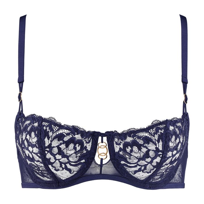 De Feeling Myself niet voorgevormde balconette BH van Aubade is uitgevoerd in de kleur Astral Blue. Het donkerblauwe kant komt erg mooi uit op de huid. De cups centreren de borsten en geven optimale ondersteuning. De bh is dubbel laags en gevoerd met tule net zoals dat achterzijde van de bh van zachte tule is. Boven de cups zit een leuk gedraaid effect met gouden sierringetje. Tussen de cups zit een opening met prachtige gouden sierringetjes. Broderie loopt over de cups en heeft een mooi geschulpt randje. Aan de zijkanten en de achterkant is de bh gemaakt van hele zachte tule stof. Combineer deze BH met een van de mooie uit gewerkte bijpassende slips en je hebt een prachtige set. Ultieme verfijning en een vrouwelijk gevoel geven deze bh jou!-