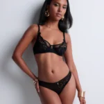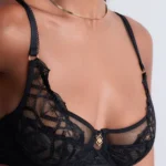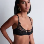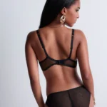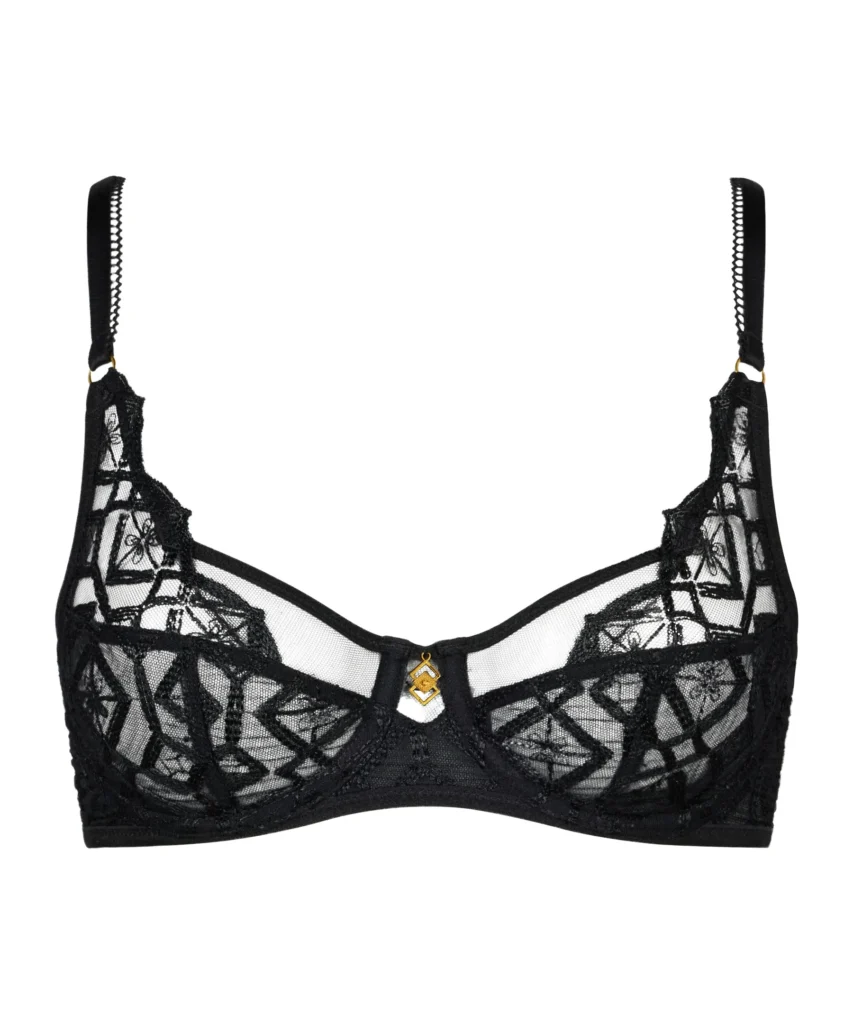 Details: De Sense of Illusion beugel-BH van Aubade is uitgevoerd in de kleur Black. De cups zijn versierd met grafische broderie die elegant doorloopt in de schouderbandjes en gecombineerd is met verfijnde, verleidelijke details. Subtiele transparante tule en kleine gouden accenten zorgen voor een luxe en sensuele uitstraling. De stevige tule cups liften en centreren de borsten en creëren een prachtig decolleté. Voor een complete en verleidelijke set combineer je deze BH met een van de bijpassende slips en de jarretels. Wat deze BH extra bijzonder maakt: hij is vervaardigd uit duurzame, gerecyclede materialen — een stijlvolle keuze met oog voor het milieu.