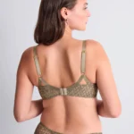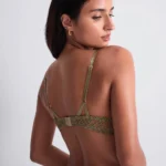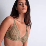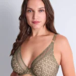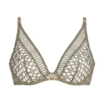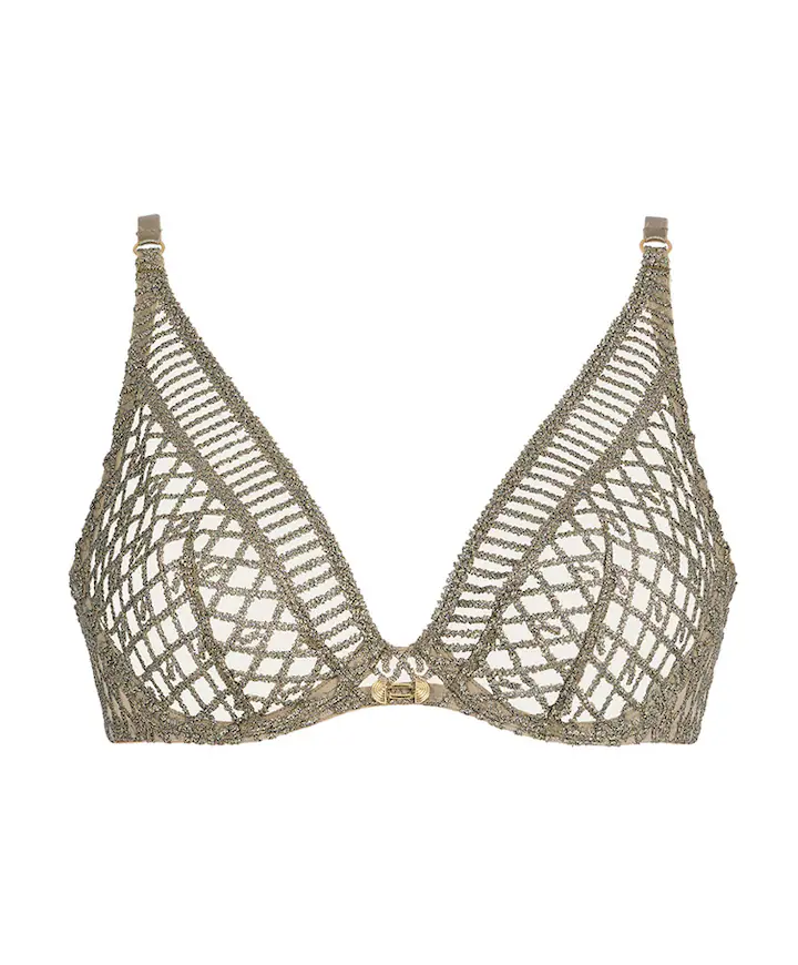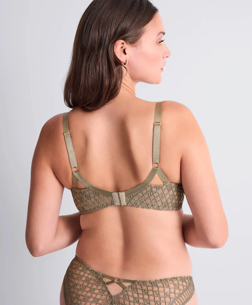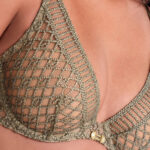 Deze Aubade Stardust Dream beugel bh is uitgevoerd in de kleur Nile Green. Deze fantastische serie hadden wij vorig jaar in het goud en was een groot succes! Logisch, want deze Aubade serie Stardust dream is in 1 woord WAUW! Stardust Dream will win you over with iets precious, luxurious embroidery and delicate pearl effect, enchanced by a host of refined, sexy details! Nu in de nieuwe kleur Nile green. Een prachtige olijfgroene kleur die fantastisch matcht met al je kleding! Deze bh heeft alles, lijkt als een juweel, bh en kledingstuk in één! Deze plunge bh die diep is uitgesneden geeft de borsten een mooie ronde vorm en prachtig decolleté. Luxueuze broderie en transparante mesh zorgen voor een sexy en fashionable look en geven optimale ondersteuning. De gouden bedels tussen de cups geven nog meer allure aan deze ware eyecathcer! De bh heeft een haaksluiting op de rug en vaste, verstelbare schouderbandjes. Deze bh mag echt gezien worden! Combineer met een mooie doorschijnende blouse of blazer en geloof, jij straalt! Combineer met één van de bijpassende slipjes en je hebt een prachtige set. LIMITED STOCK!-