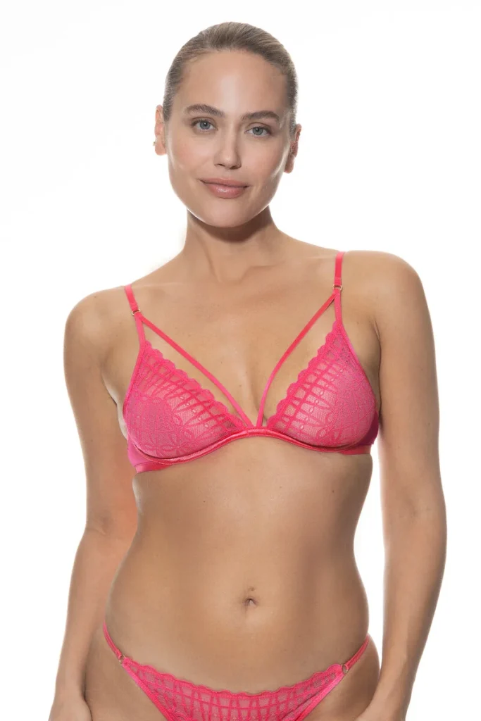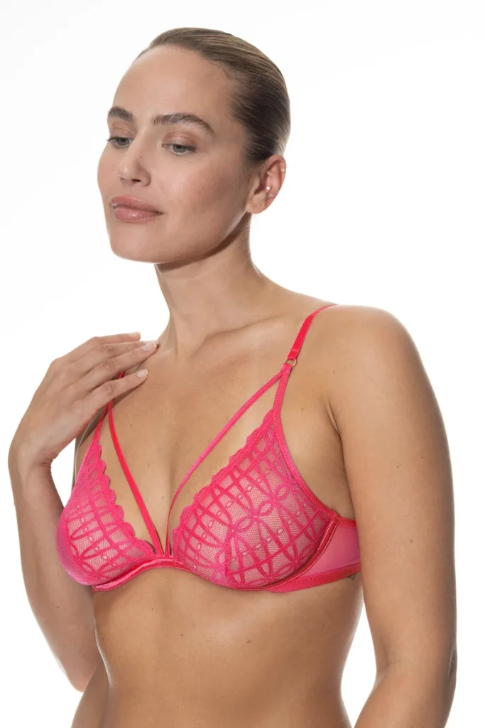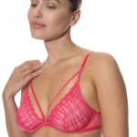 Deze Captivating Mey beugel bh is in de kleur Exotix pink. Een opvallende kleur roze die iedereen prachtig zal staan! Een absolute highlight is deze Captivating Mey serie. Sexy, verleidelijk en wonderlijk comfortabel om te dragen. High-fashion ondergoed in de must-have kleur Exotic Pink met roségouden metalen accessoires! Deze sexy triangel bh met doorzichtig grafisch kant en de lage uitsnede geeft een prachtig decolleté. Het elastische kant sluit prachtig aan op de borst. Extra leuk is het mooie extra sierbandje. Door het hoge aandeel polyamide voelt de beha met beugels bijzonder aangenaam aan. Combineer de stijlvolle beha met de passende slip voor een verleidelijke lingerie set. Liever een voorgevormde bh? Ga dan voor het plunge model uit deze Captivating serie.Verzenden