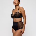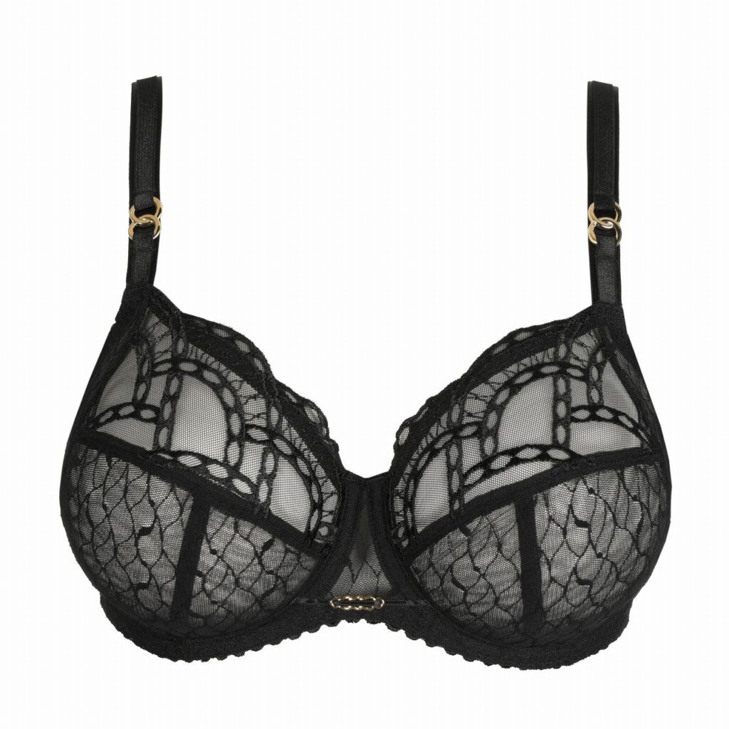 De Prima Donna NAICA volle cup bh BH met beugel in de kleur zwart biedt een stevige en comfortabele ondersteuning. Deze zwarte lingerie kenmerkt zich door een combinatie van transparante tule en kant met een grafisch kettingmotief. Goudkleurige ringetjes aan de aanzet van de schouderbandjes en tussen de cups vormen een stijlvol detail. De niet voorgevormde cups omsluiten de borst volledig en de beugel zorgt voor een natuurlijke lift. Je stelt de rechte schouderbandjes eenvoudig af op jouw gewenste lengte.