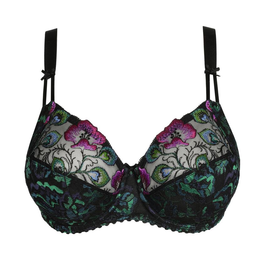 De SAN ANGEL beugel BH van Prima Donna Twist is uitgevoerd in de kleur Peacock Feather. Peacock Feather is een mix van intense kleuren. Warm fuchsia, intens blauw en groen vormen een prachtig contrast met de zwarte basis. De driedelige cups ondersteunen, liften en centreren de borsten voor een stevige pasvorm. Combineer onder een mooie licht doorschijnende blouse of top en laat juist deze geweldige bh zien!! Prachtig ook te combineren onder een mooie v-hals top of blazer. Liever een lager decolleté? Ga dan voor de plunge bh uit deze prachtige SAN ANGEL serie.Verzenden