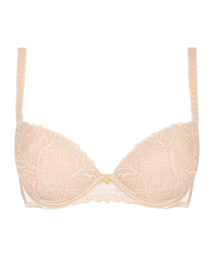 De Aubade Iconic Calypso voorgevormde BH in de kleur Huid combineert een verfijnde uitstraling met optimaal draagcomfort. Deze BH push-up is uitgevoerd met elegant borduurwerk op de cups en heeft sierlijke, bewerkte schouderbandjes. Een subtiel gouden detail siert het middenstuk tussen de cups. Dankzij de beugels en de stevige cups biedt dit model van Aubade een mooie lift en betrouwbare ondersteuning. De lichte kleur maakt dit item ideaal onder lichte kleding.