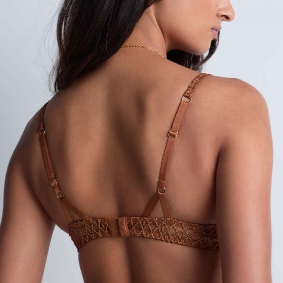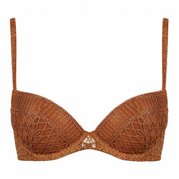 Deze voorgevormde Aubade Stardust Dream bh is uitgevoerd in het goud/koper! De amber gold Aubade serie Stardust dream is in 1 woord WAUW! Stardust Dream will win you over with iets precious, luxurious embroidery and delicate pearl effect, enchanced by a host of refined, sexy details! Deze bh heeft alles, lijkt als een juweel, bh en kledingstuk in één! Dit bekende plunge push-up model is laag uitgesneden en geeft een prachtig decolleté. De cups zijn overtrokken met luxe broderie, met een stevige tule ondergrond en een mooie band langs de cups. De bh heeft een haaksluiting op de rug en vaste, verstelbare schouderbandjes. Tussen de cups zit een gouden bedel. Deze bh mag echt gezien worden! Combineer met een mooie doorschijnende blouse of blazer en geloof, jij straalt! Combineer met één van de bijpassende slipjes en je hebt een prachtige set of ga voor de prachtige top uit deze serie. LIMETED STOCK!Verzenden