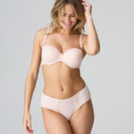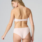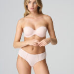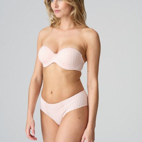 De Marie Jo AVERO strapless bh is lichtroze met een all over ruitjes print. Een prachtige zachte kleur met een mooi glittertje in de bloemetjes. De bh heeft een meer horizontale cupbelijning. De rechte rug heeft een haaksluiting en een siliconenband die extra steun biedt als de bh strapless gedragen wordt. Bij de bh worden schouderbandjes geleverd voorzien van Avero-bloemetjes. De schouderbandjes kunnen recht of om de hals gedragen worden. De bh lift de boezem, zonder die extra te centreren en geeft extra steun dankzij het hogere stukje in het midden tussen de borsten. Tussen de cups zit een strikje en bloementjes. Ook in ivoorkleur verkrijgbaar.