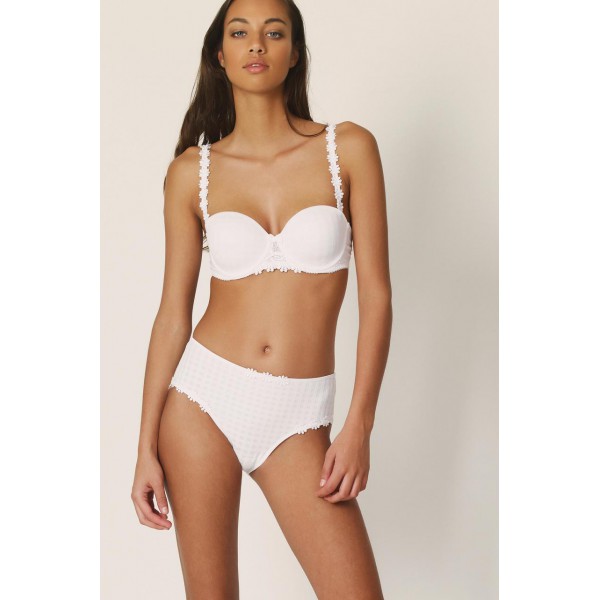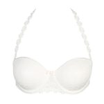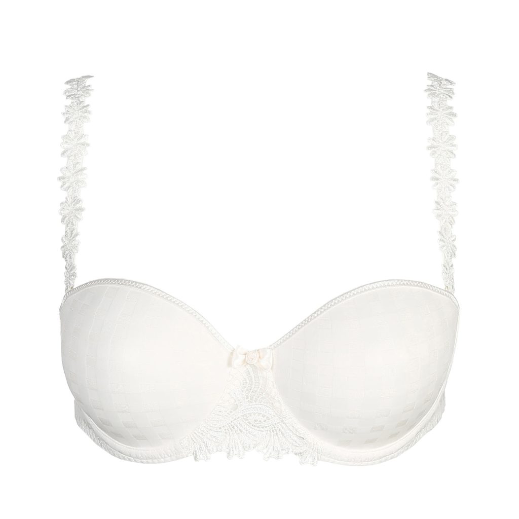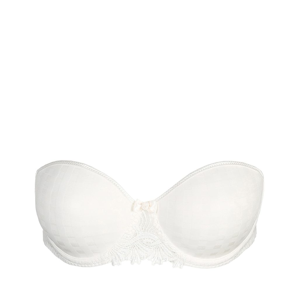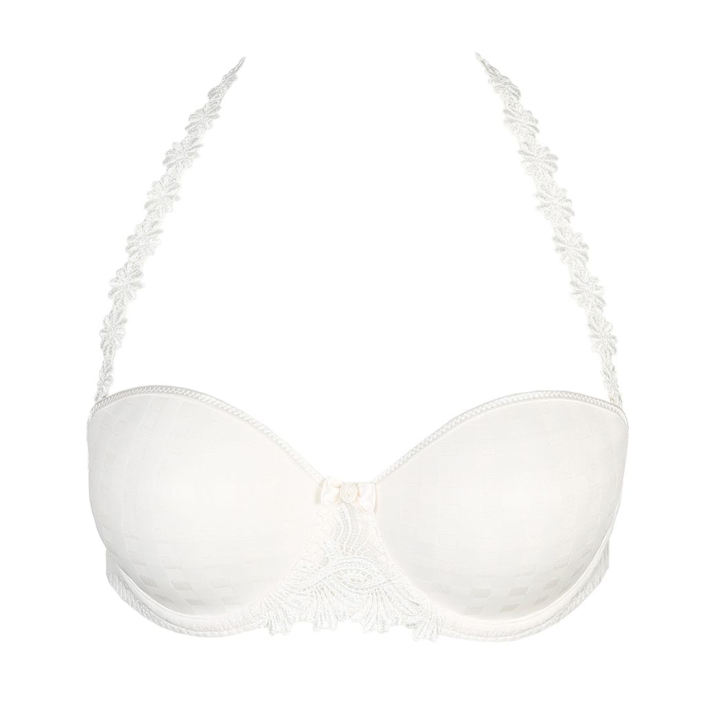 De Marie Jo AVERO strapless bh is ivoor met een all over ruitjes print. De kleur ivoor is een zachte variant op wit. Een tint die past bij elke huidstype en een topper voor bruidjes. De bh heeft een meer horizontale cupbelijning. De rechte rug heeft een haaksluiting en een siliconenband die extra steun biedt als de bh strapless gedragen wordt. Bij de bh worden schouderbandjes geleverd voorzien van Avero-bloemetjes. De schouderbandjes kunnen recht of om de hals gedragen worden. De bh lift de boezem, zonder die extra te centreren en geeft extra steun dankzij het hogere stukje in het midden tussen de borsten. Tussen de cups zit een strikje en bloementjes. Ook in lichtroze verkrijgbaar.Verzenden