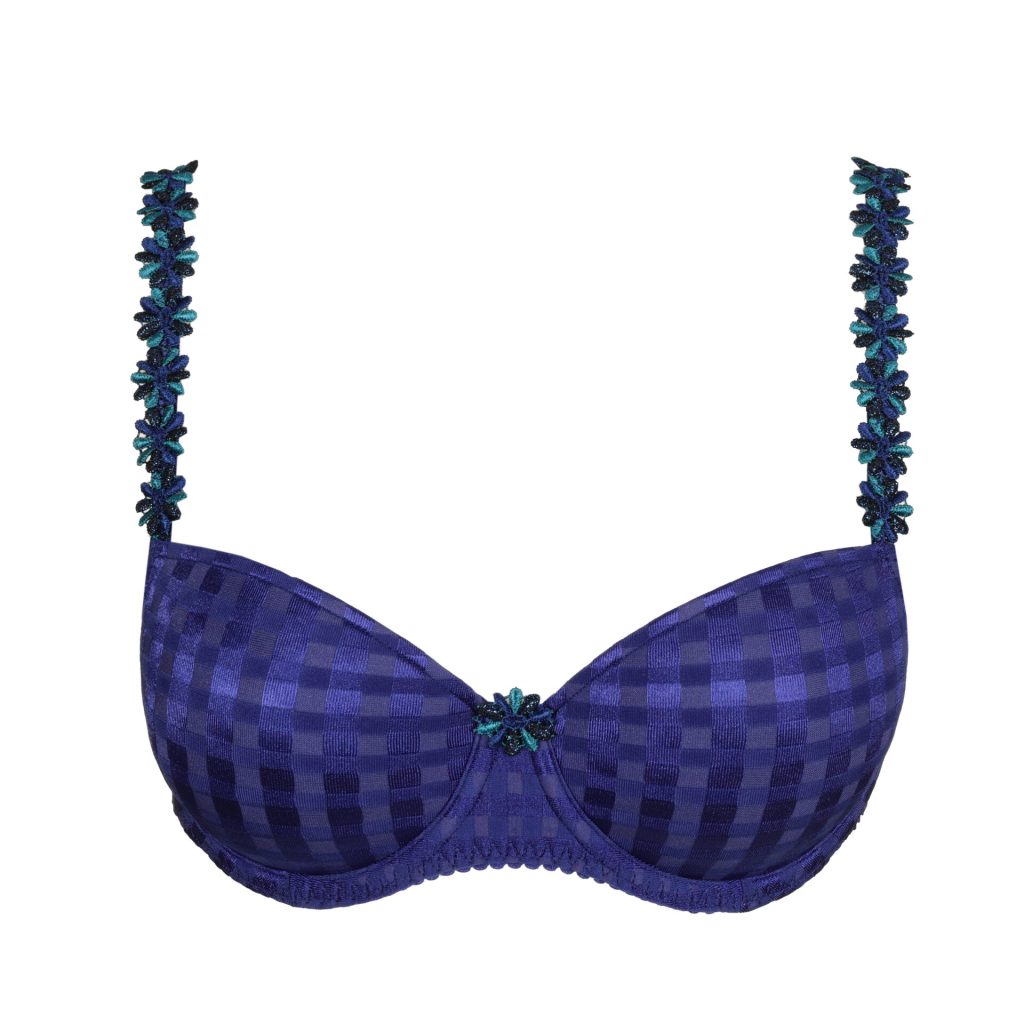 De Marie Jo AVERO voorgevormde balconnete bh is er nu in deze prachtige kleur Lazarite! Een super mooie sprekende kleur! Een all over ruitjes print met prachtige glans gecombineerd met het bekende Avero bloemetje. De bloemetjes zijn 2 kleurig blauw met klein glimmertje, dus vallen extra op. De bh heeft een gladde cup ideaal te dragen als t-shirt bh en de achterkant is effen met een haaksluiting op de rug. Verder heeft de bh verstelbare bandjes welke recht of om de hals gedragen kunnen worden. Tussen de cups zit een bloem. Combineer met één van de bijpassende slips uit deze serie en je hebt een prachtige set! Is ook in taupe en zwart verkrijgbaar.Verzenden