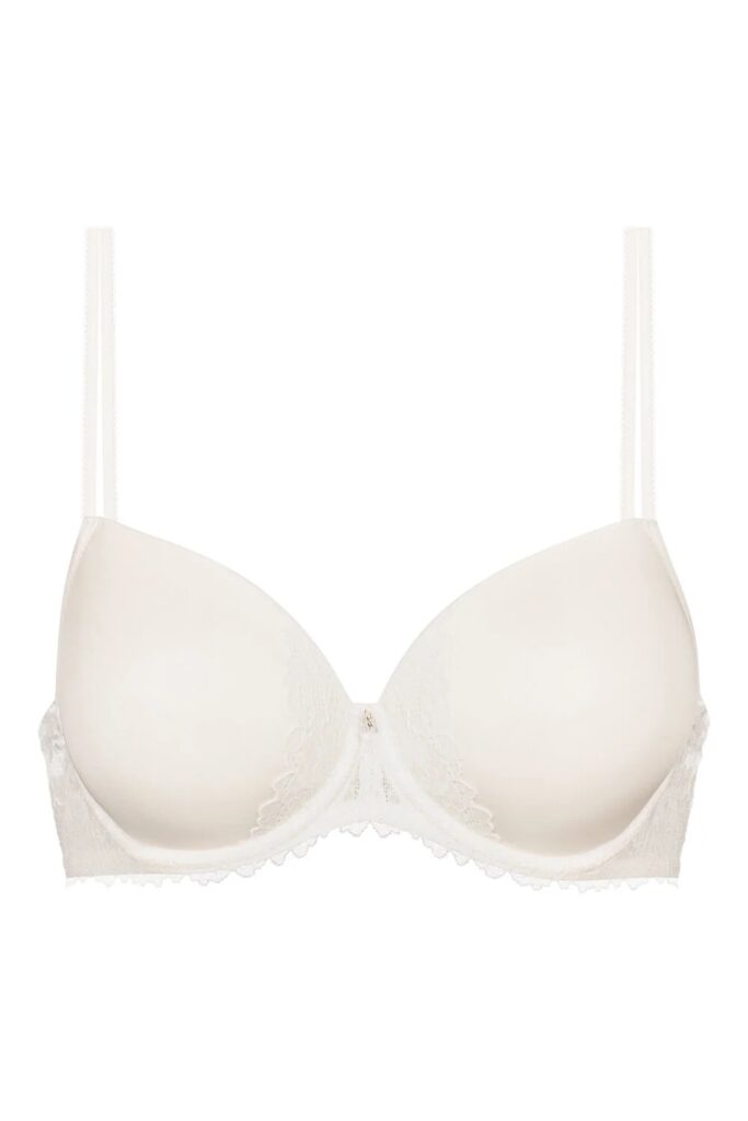 De Mey LUXURIOUS bi-strech voorgevormde bh in het ivoor kleur. De cups zijn effen en zijn rondom afgewerkt met kant. Een fijne t-shirt bh onder nauwsluitende kleding, de cup omsluit de gehele borst. De achterkant is ook van kant. De bh heeft een haaksluiting op de rug en vaste, verstelbare schouderbandjes. De schouderbandjes zijn speels afgewerkt. Tussen de cups zit een hangertje. Het model Luxurious is hetzelfde als Allegra en Amorous.-