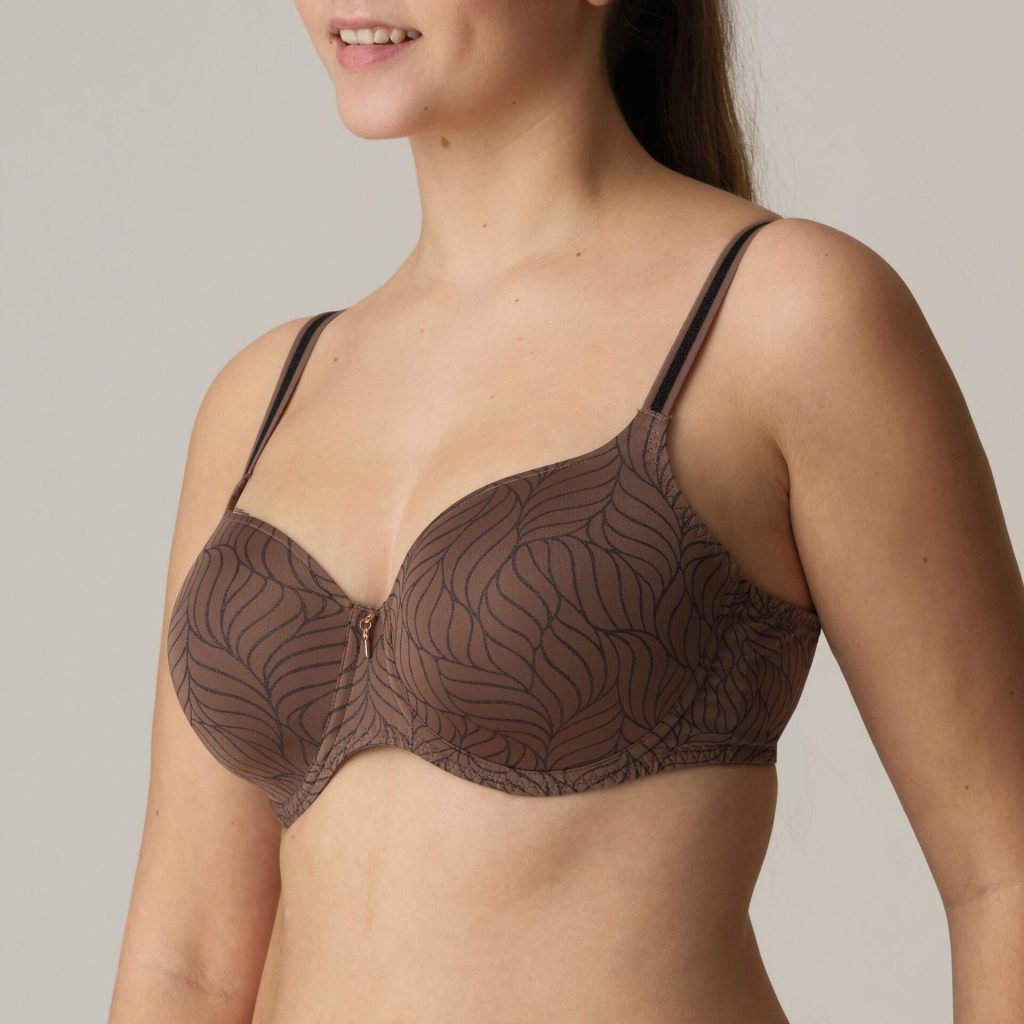 De Ajusco hartvorm BH van Prima Donna Twist is uitgevoerd in de kleur Caribe Taupe. Caribe Taupe is een taupetint met een elegante eyeshadow-glans en een fijn glittermotief in een soort bladmotief. Deze voorgevormde bh met mousse cups centreren en ondersteunen de borsten en zorgen voor een mooie ronde borstvorm. Tussen de cups is een mooie bedeltje verwerkt. De schouderbandjes hebben een leuke zwarte bies met subtiel glittertje. Deze mogen gezien worden. Deze prachtige bh staat warm op je huid en makkelijk combineerbaar met elke najaarsoutfit.-