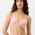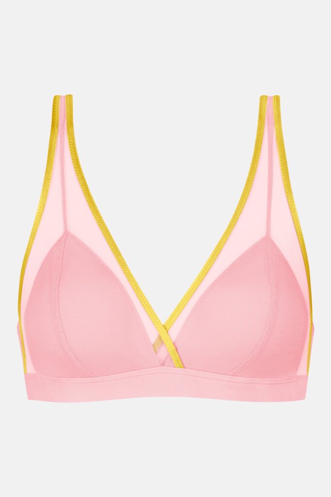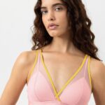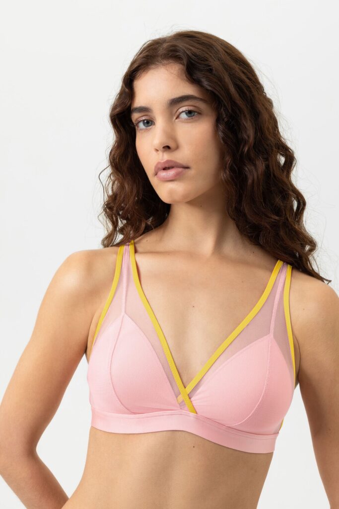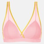 De Mey POETRY almost sheer BH zonder beugel (312) is uitgevoerd in de kleur Rose met sportieve gele accenten langs de zoom. Deze bh zonder beugel kenmerkt zich door de semi-transparante mesh panelen boven de cups. De elastische onderband zorgt voor ondersteuning en een comfortabele pasvorm. Je verstelt de smalle schouderbandjes eenvoudig naar wens. Aan de achterzijde sluit je deze Mey bh met een klassieke haaksluiting.