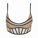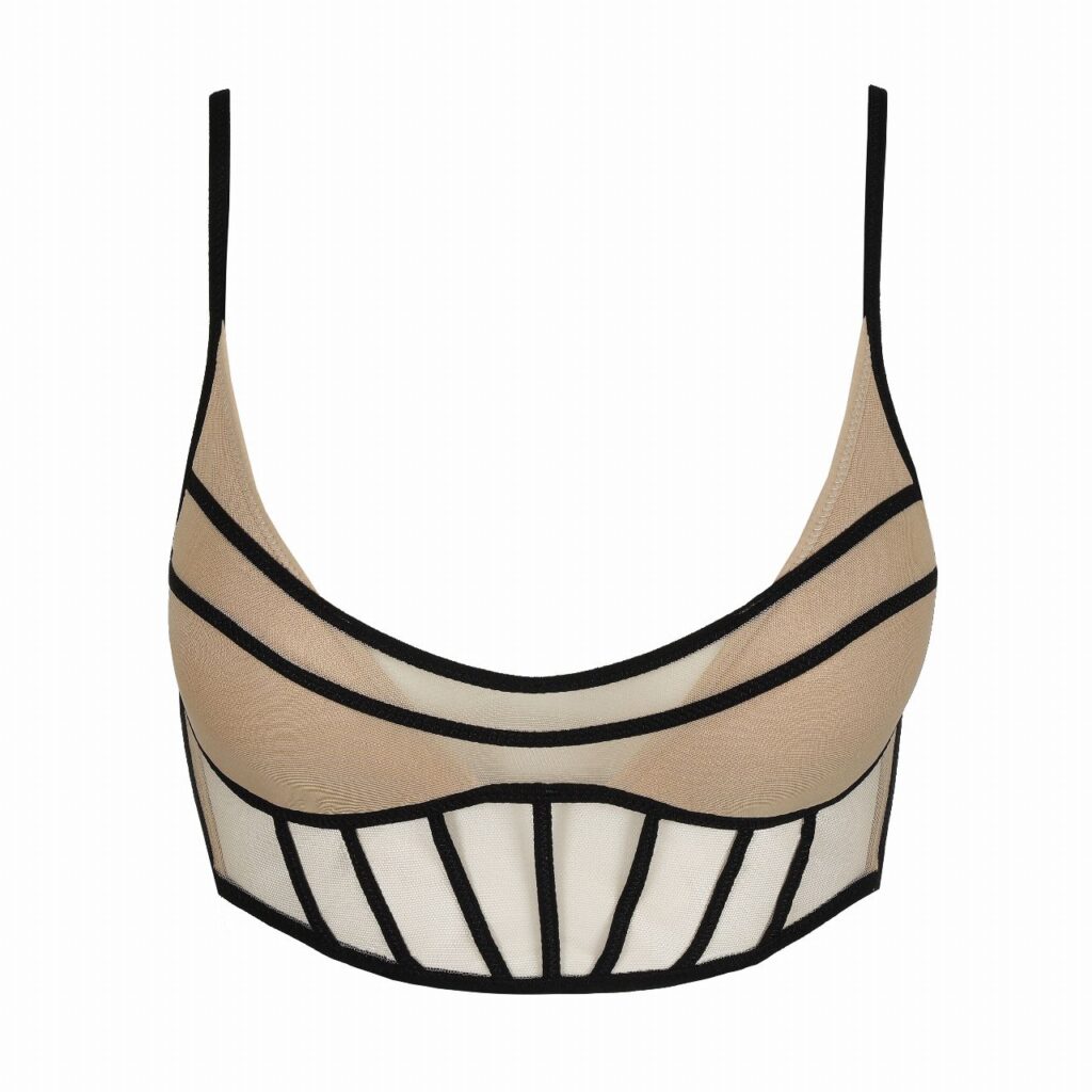 De Sarda Yulimar voorgevormde top BH in de kleur Huid heeft een eigentijds ontwerp en biedt een comfortabele pasvorm. Dit item beschikt over gladde cups die zorgen voor een natuurlijk en rond silhouet. Het model kenmerkt zich door grafische zwarte lijnen die contrasteren met de transparante mesh structuur en de beige stof. Een brede band onder de borst zorgt voor aansluiting op het lichaam. De smalle schouderbandjes zijn aan de achterzijde verstelbaar voor de juiste lengte. Als verfijnde BH zonder beugel voelt deze top van Sarda licht aan en biedt deze voldoende ondersteuning voor dagelijks gebruik.