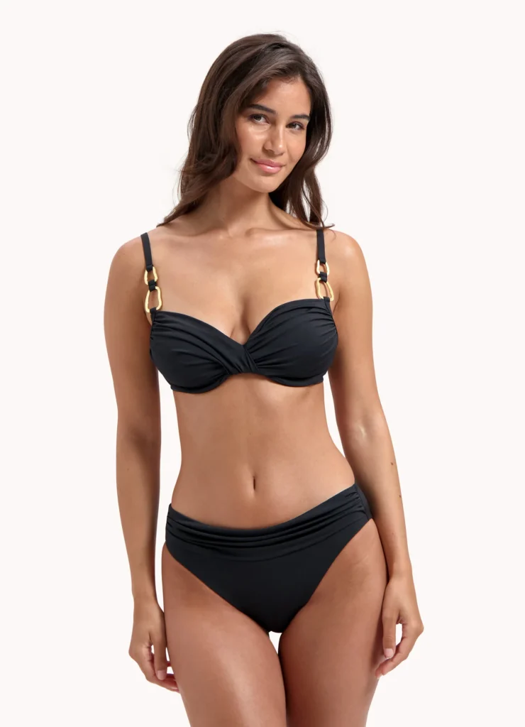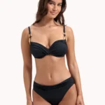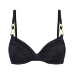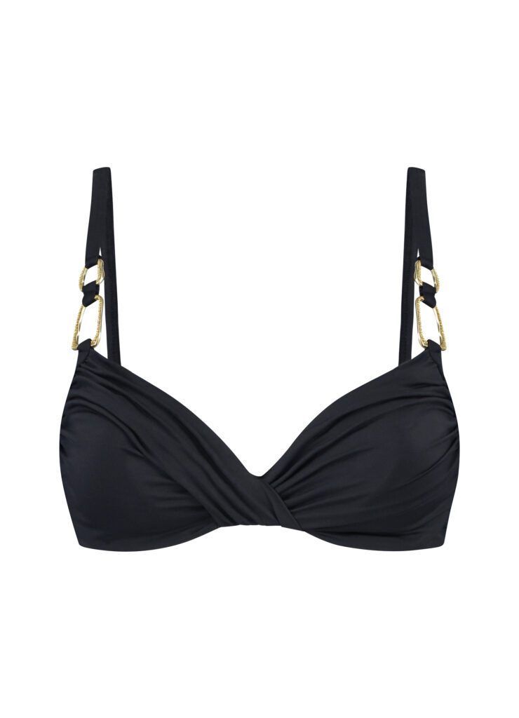 Details: Deze prachtige Femme Noir beugel bikini top van de nieuwe Cyell Design collectie is zwart. De stof van deze mooie bikinitop vormt zich super om je borsten en biedt optimale ondersteuning. Extra leuks is het twist detail tussen de cups. Deze top is vrouwelijk, luxe, heel stijlvol voor boven alles heel comfortabel. Een echte musthave! Soms zegt zwart meer dan duizend kleuren. Femme Noir is een ode aan tijdloze klasse. Diepe zwarte tinten worden gecombineerd met gouden accenten en verfijnde afwerkingen, voor een elegante en verleidelijke uitstraling. De badpakken en bikini’s zijn stijlvol en flatterend, met hoge beenuitsnijdingen en ondersteunende tops – perfect voor een krachtige, vrouwelijke look. Combineer de Femme Noir bikini met de bijpassende zwarte pareo of beach accessoire voor een chique uitstraling.