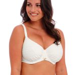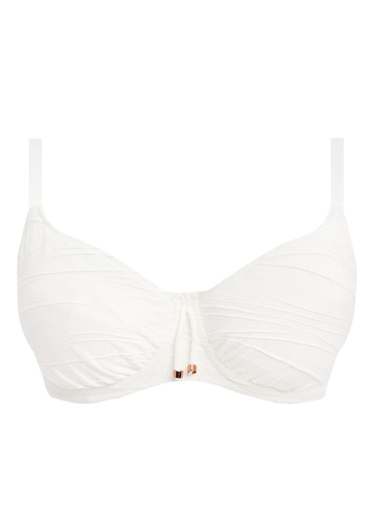 Details: De Beach Waves full cup bikinitop van Fantasie Swim is uitgevoerd in de prachtige kleur Linnen. Deze ivoorkleurige top heeft een gestructureerde stof met plooien. Deze niet voorgevormde bikini met beugel geven de borsten optimale ondersteuning. De bikinitop valt hoog over de borsten en is gemaakt van super comfortabel stretch materiaal. Perfect model voor de grotere cup maten. De cups zijn versierd met 2 touwtjes met een roségouden ringetje. Combineer deze bikinitop met het bijpassende bikinibroekje voor een perfecte beachlook! Ben je gewend Prima Donna te dragen? Kies dan 1 cupmaat groter.
