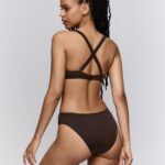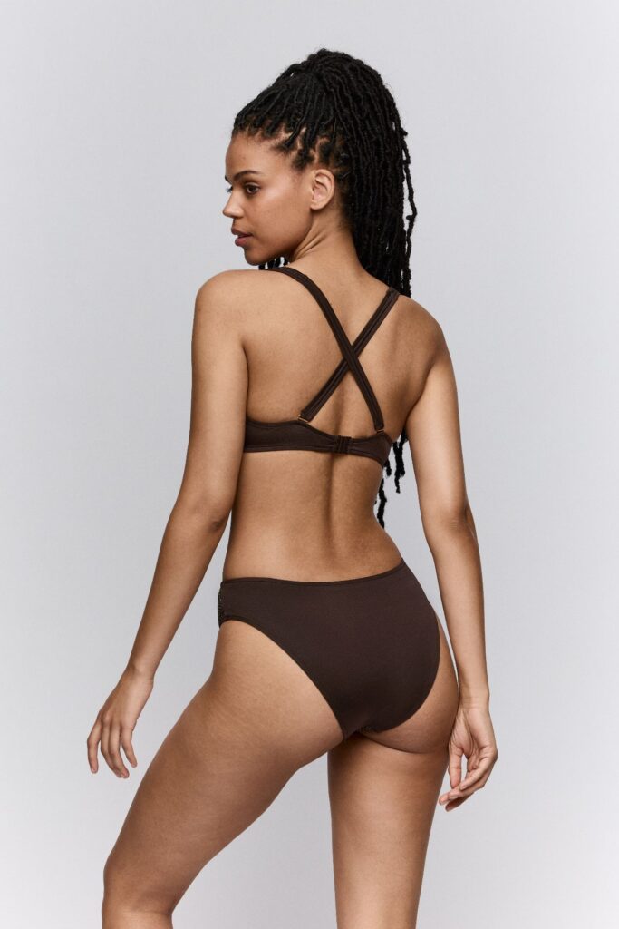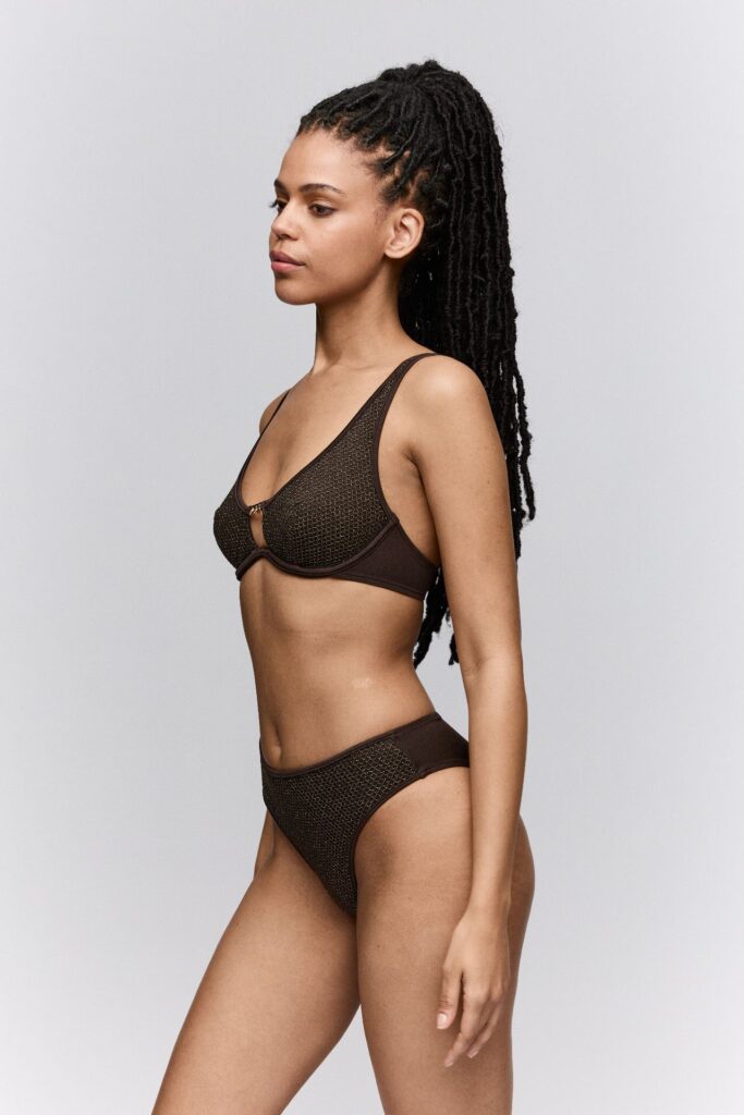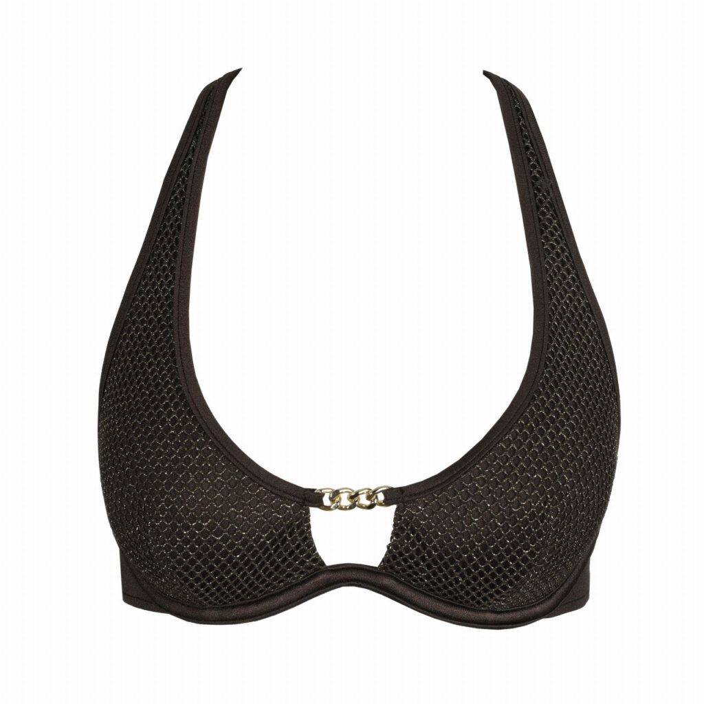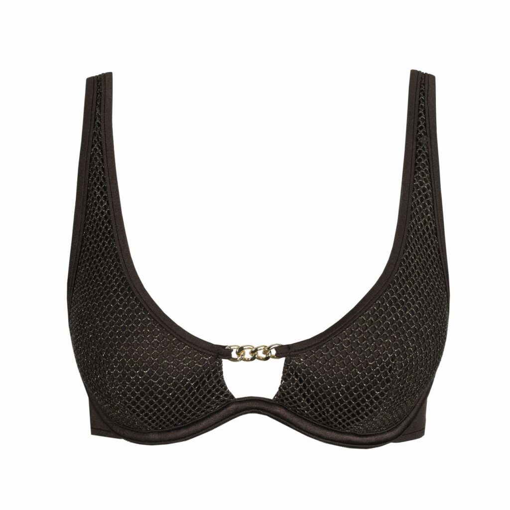 Deze SardaSwim JANJA Flexi Wire Bikinitop bikini top is uitgevoerd in een diepe kleur bruin met een subtiele glinstering. Het materiaal heeft een opvallende netstructuur over de cups wat zorgt voor een luchtig effect. Tussen de borsten is een goudkleurig schakel detail geplaatst als blikvanger. Deze bikini met beugel biedt stevigheid en ondersteuning zonder extra vulling. De bandjes strik je eenvoudig in de nek zodat je de pasvorm zelf aanpast.
