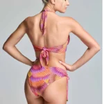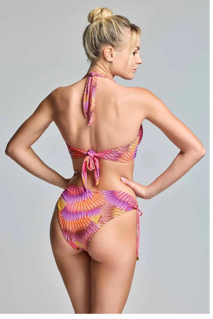 Deze Vacanze Mango beugel print bikini set in pink toont een grafisch dessin. De bikini met beugel heeft een decolleté strikje en halterbanden. Het broekje bevat strikkoordjes met gouden bedels. Comfortabele badmode voor warme dagen.