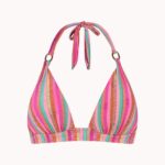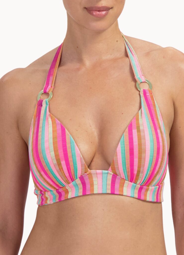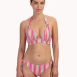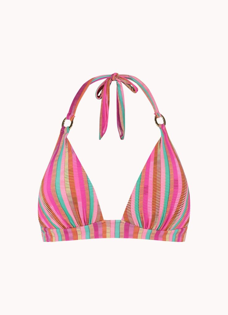 De Cyell TROPICAL LINES halter bikini top combineert een zomers ontwerp met een fijne pasvorm. Deze bikinitop in de kleur Pink valt op door het verticale streepdessin en de stof met een voelbare reliëfstructuur. Gouden ringen verbinden de cups met de halterbandjes. De stevige cups bieden ondersteuning en creëren een mooie vorm, vergelijkbaar met het effect van een bikini push up. Je strikt de top eenvoudig in de nek en op de rug voor de gewenste maat.