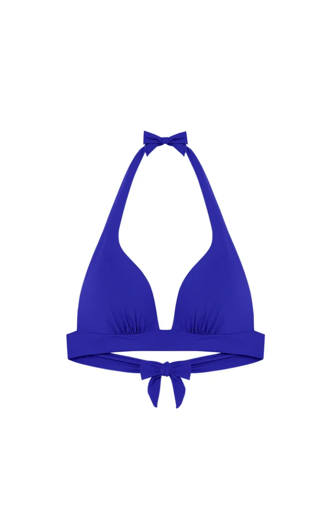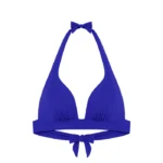 De Pain de Sucre DONIA 61 push-up bikini top in de kleur blauw heeft een vrouwelijk en tijdloos ontwerp. Deze bikini push-up is voorzien van stevige, voorgevormde cups die zorgen voor een liftend effect en een diep decolleté. De stof voelt glad aan en aan de onderzijde van de cups zijn subtiele plooien verwerkt. Je strikt de brede banden als halter in de nek en knoopt de brede band op de rug vast voor een aansluitende pasvorm.