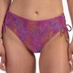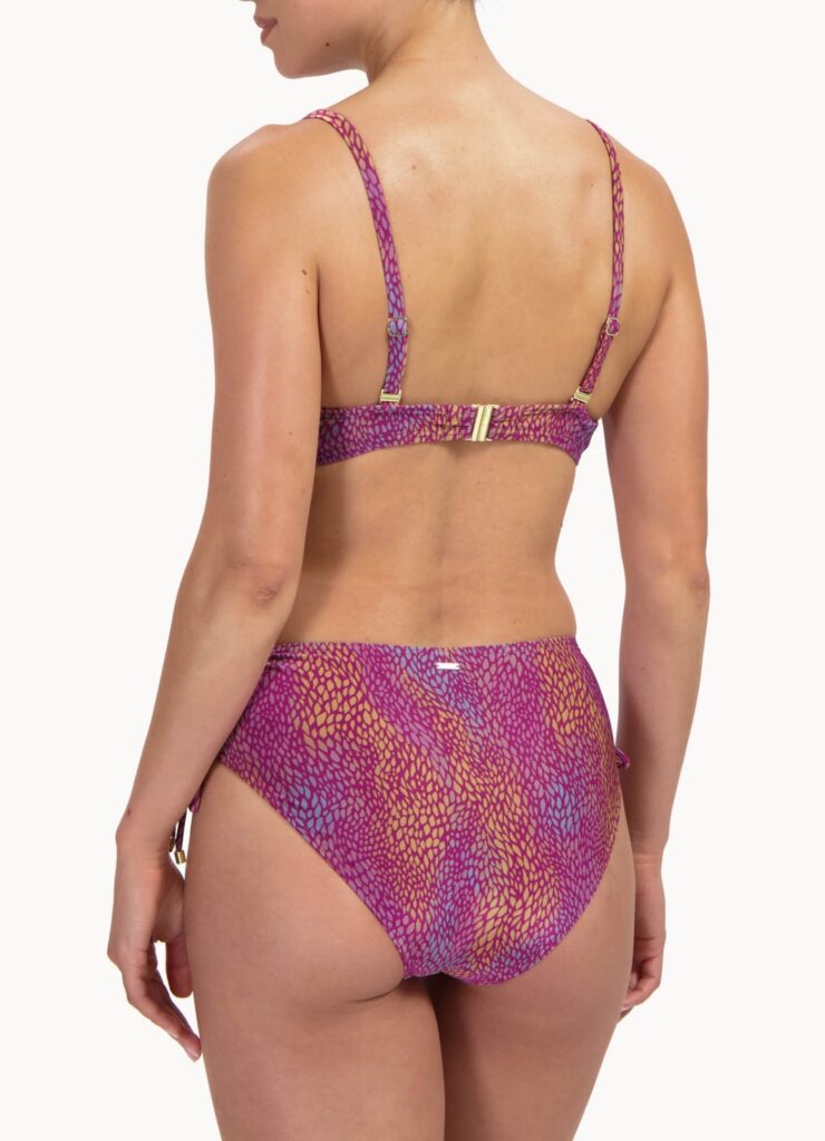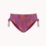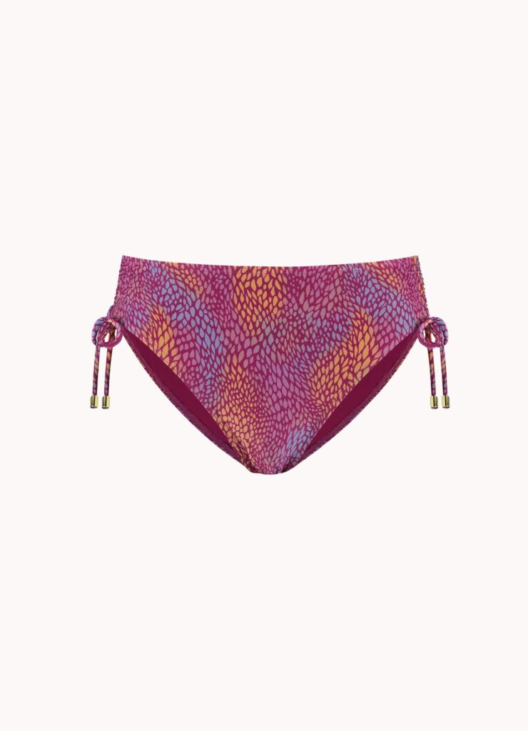 De Cyell BURGUNDY DROPS high bikini slip (441) is een kleurrijk onderdeel voor je badmode collectie. Deze bikini slip in de kleur paars is voorzien van een levendig dessin met oranje en blauwe accenten die de stof sieren. Aan de zijkanten bevinden zich aantrekkoorden met goudkleurige details, waarmee je de hoogte van de zijkanten zelf aanpast en een geplooid effect creëert. Het materiaal voelt glad aan en het broekje biedt een comfortabele bedekking aan de achterzijde.