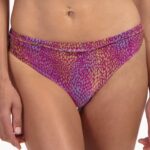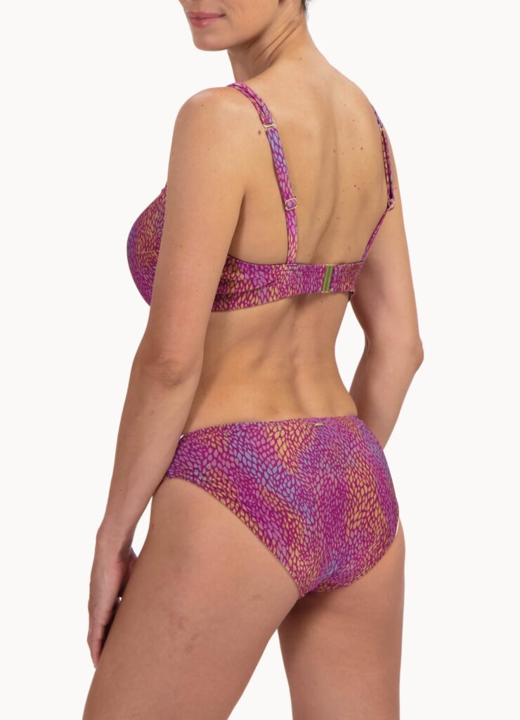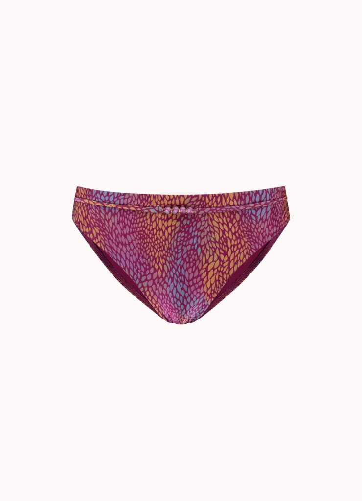 Deze Cyell BURGUNDY DROPS mid bikini slip (441) is uitgevoerd in de kleur paars met een levendig dessin. De bikini slip heeft een normale pasvorm die comfortabel aansluit op de heupen. Aan de bovenzijde is de stof afgewerkt met een smal sierbandje en subtiele kraaltjes voor een verfijnd detail. Het gladde materiaal voelt prettig aan op de huid en droogt snel op. Dit broekje vormt een stijlvolle basis voor jouw zomerse outfit.