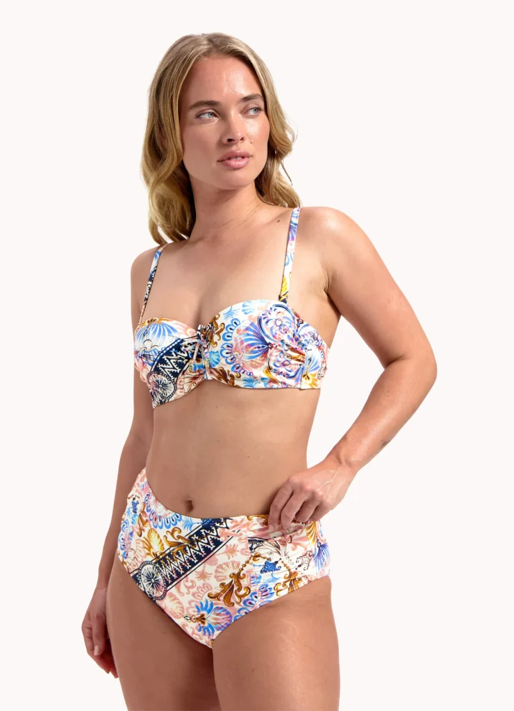 Details: De Classic fushion tailleslip van Cyell heeft een mooie kleurenmix in verschillende prints. Oranje, roze, bruin en verschillende kleuren blauw zijn allemaal in deze bikini verwerkt. Het broekje valt hoog op de heupen en heeft leuke strikjes die je zelf naar wens strakker of losser kunt strikken. Ook die hoogte kun je hier zelf wat in aanpassen. Zo zit het broekje altijd perfect! De hoge uitsnijding van de benen creëert een slank silhouet. Broekje is volledig gevoerd.
