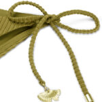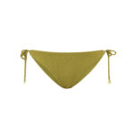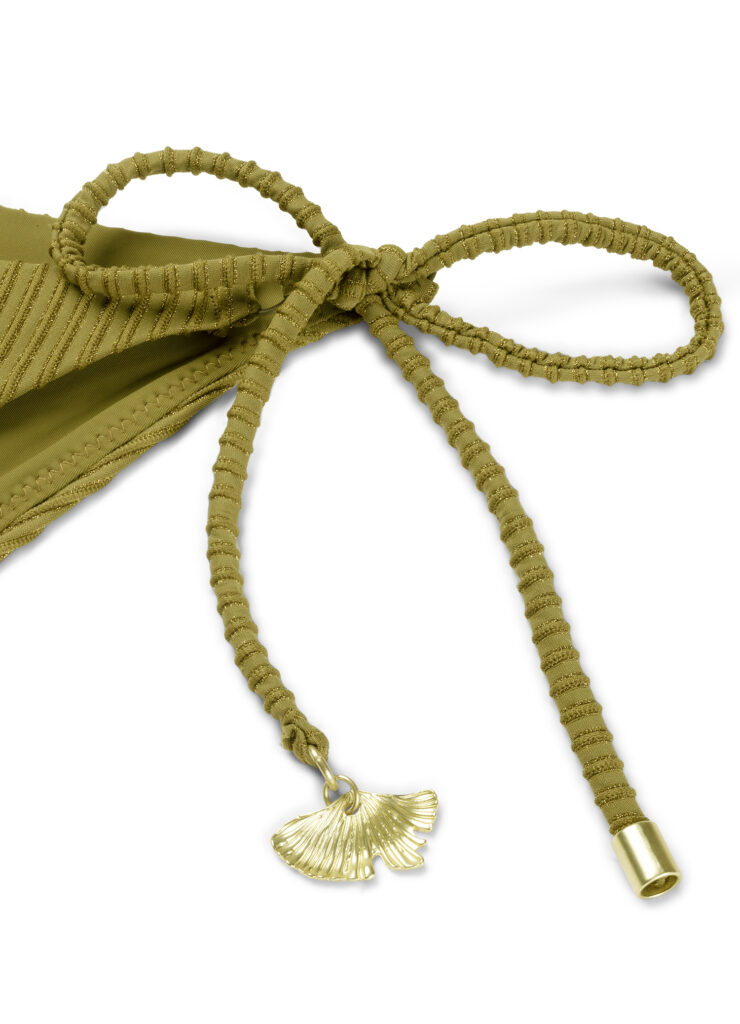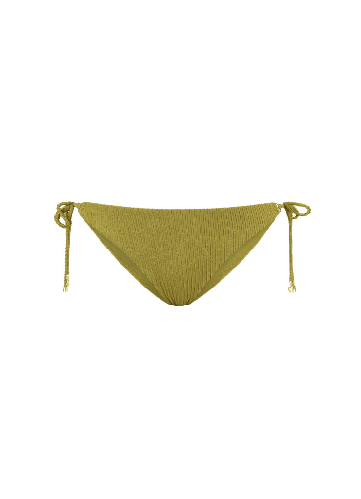 Details: Deze strik bikini slip uit de Chic Verde Cyell Design collectie is olijfgroen. Gemaakt in een ribstructuur met zachte gouden lurex draad. Het broekje heeft strikjes op de heupen en deze kun je naar wens zelf strakker of losser strikken, zodat het broekje altijd perfect zit. De hoge uitsnijding van de benen creëert een slank silhouet. Broekje is volledig gevoerd.