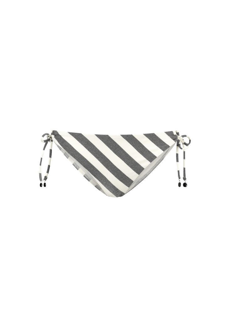 Details: De Glitz strik slip van Cyell heeft een leuke zilver/antra kleurige glitter streep motief. De ivoorkleurige achtergrond komt heel mooi uit op de huid. Broekje is gemaakt van een fijne zacht stof waar een subtiel glimmertje in is verwerkt. Het broekje valt laag op de heupen en heeft leuke strikjes die je zelf naar wens strakker of losser kunt strikken. Ook die hoogte kun je hier zelf wat in aanpassen. Zo zit het broekje altijd perfect! De hoge uitsnijding van de benen creëert een slank silhouet. Broekje is volledig gevoerd. Wil je een wat hoger model ga dan voor het taille broekje uit deze Glitz collectie.