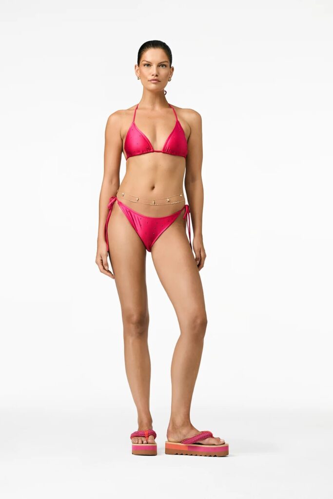 Deze Pink bikini slip van Goldbergh is uitgevoerd met subtiel glanzende steentjes op de gladde stof. De zijstrikjes stel je zelf af voor jouw pasvorm op de heup. Achter zorgt een gerimpelde naad voor een aansluitende vorm en een nette fit. Dit model, de Goldbergh KAIA strik italian rose bikini slip, is een comfortabel bikinislipje voor zonnige dagen.