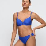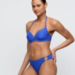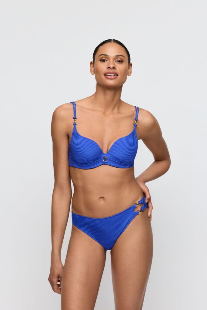 De MarieJo Swim EMLY bikini rioslip bikini slip (441) is uitgevoerd in een heldere kleur blauw. Het materiaal kenmerkt zich door een voelbare ribstructuur over de gehele stof. Aan de zijkant verbindt een set goudkleurige ringen de voorzijde en achterzijde voor een elegant accent op de heup. Deze bikini slip heeft een normale beenuitsnijding en bedekt de billen gedeeltelijk. Met de kwaliteit van MarieJo Swim geniet je van een verzorgde pasvorm en een stijlvol ontwerp.Highlights