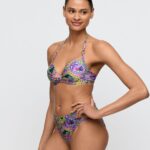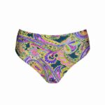 De MarieJo Swim JOLISE bikini slip met omslag bikini slip (441) is uitgevoerd in een levendige paisley print waarbij de kleur paars centraal staat. Dit model beschikt over een omslagband aan de taille, waardoor je de hoogte van het broekje zelf bepaalt. De stof voelt glad aan en de slip is volledig gevoerd voor een prettig draagcomfort. Deze bikini slip sluit netjes aan en biedt een normale bedekking, wat zorgt voor een rustige uitstraling.