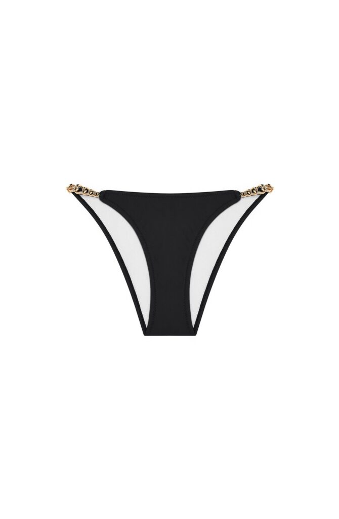 De Pain de Sucre JONES 61 bikini slip (441) is uitgevoerd in een diepe kleur zwart en biedt een elegante basis voor je strandoutfit. Dit model kenmerkt zich door de goudkleurige schakelkettingen aan de zijkanten die zorgen voor een verfijnd detail op de heupen. Het broekje is gemaakt van een gladde stof die prettig aanvoelt op de huid. Door de neutrale tint is deze zwarte bikini slip eenvoudig te combineren met verschillende tops. Met dit item van Pain de Sucre kies je voor een stijlvolle en tijdloze look aan het zwembad.