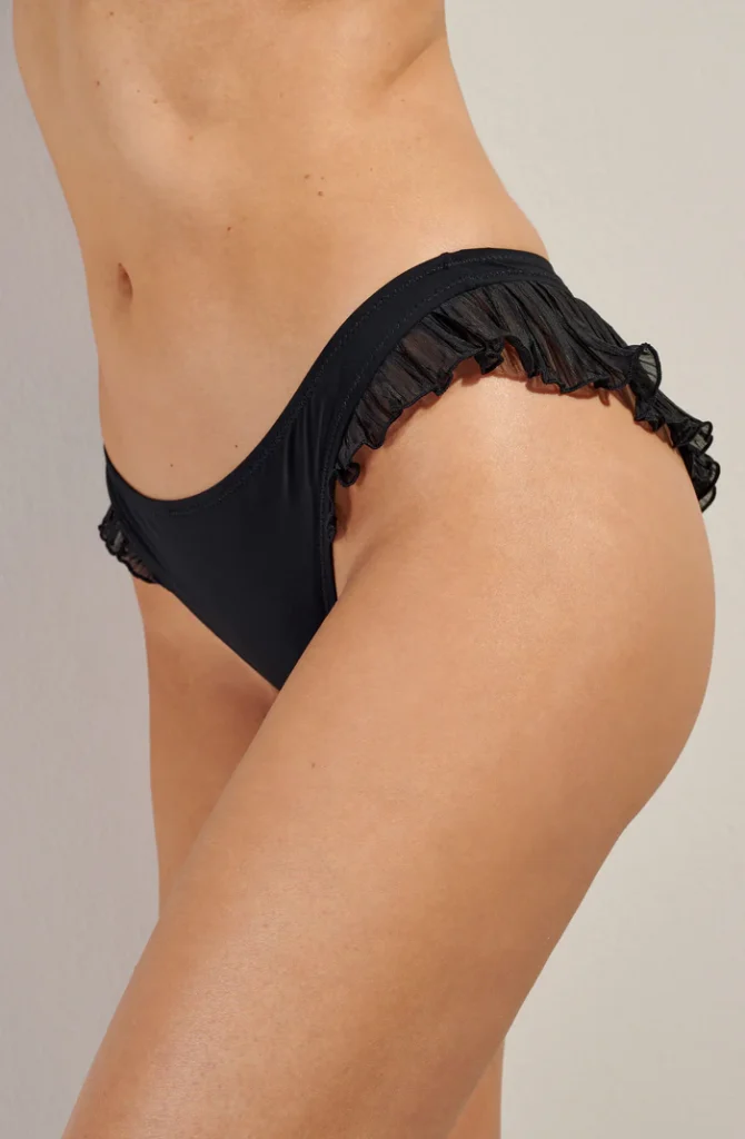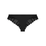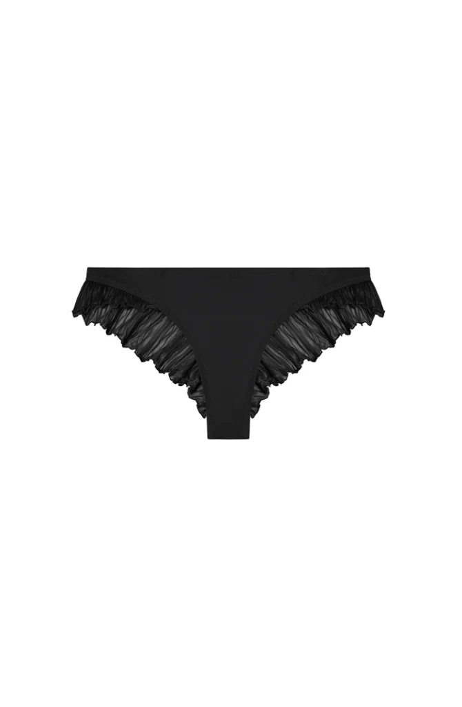 De Pain de Sucre MALALA 61 bikini slip in de kleur zwart combineert een tijdloze tint met opvallende details. Deze bikini slip is afgewerkt met sierlijke ruches van fijn materiaal langs de randen, wat zorgt voor een speels effect. Het model valt glad op de huid en biedt een comfortabele pasvorm. Met deze zwarte badmode van Pain de Sucre kies je voor een stijlvol item voor zonnige dagen.