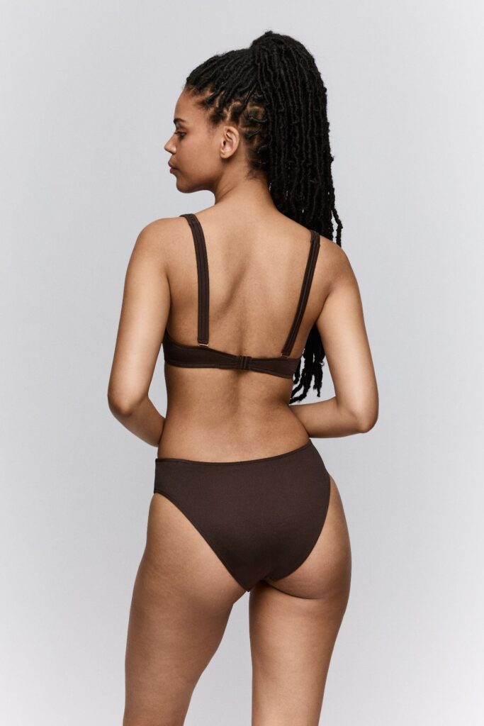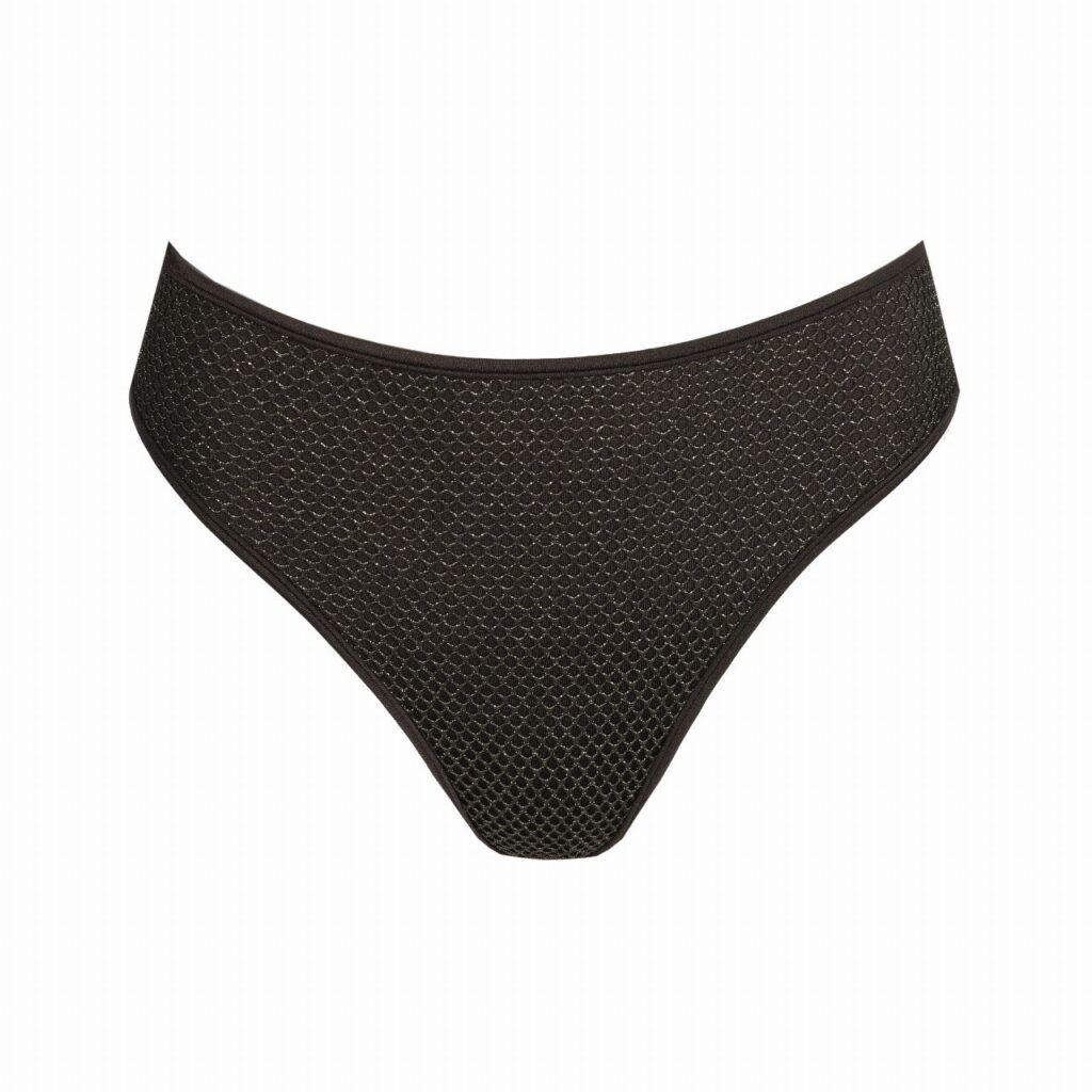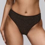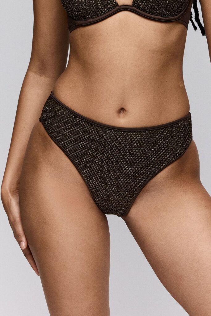 De SardaSwim JANJA bikini tailleslip bikini slip (441) is uitgevoerd in de kleur bruin en heeft een verfijnde uitstraling. Deze bikini slip kenmerkt zich door een dubbele laag stof, waarbij de toplaag bestaat uit een netstructuur met een subtiel goudkleurig glittereffect in een honingraatpatroon. Het model valt hoog in de taille en heeft hoog uitgesneden beenopeningen die je benen optisch verlengen. De tailleband en beenopeningen zijn afgewerkt met een gladde, donkerbruine bies voor een comfortabele aansluiting op de huid. Dit SardaSwim item biedt volledige bedekking en is gemaakt van elastisch materiaal dat prettig aanvoelt.