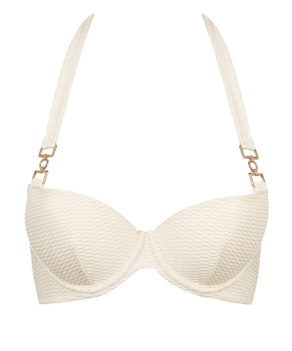 Details: De Shimmering Waters voorgevormde bikinitop van Aubade Badmode is uitgevoerd in de kleur Golden White. Deze ivoorkleurige bikinitop is gemaakt van een luxe jacquardstof, verrijkt met een gouden lurexdraad. Hierdoor krijg je een prachtig glimmertje in de stof. De bikinitop heeft aa de schouderbandjes prachtige gouden bedels. Door de voorgevormde cups worden de borsten gecentreerd en krijgen ze een mooie ronde vorm. De top sluit op de rug met een clipsluiting en is in de nek naar wens te strikken. Combineer deze bikinitop met een van de bijpassende bikinibroekjes en je hebt een waanzinnige set! Liever zonder beugel? Ga dan voor de mooie haltertop uit deze Shimmering Waters serie.