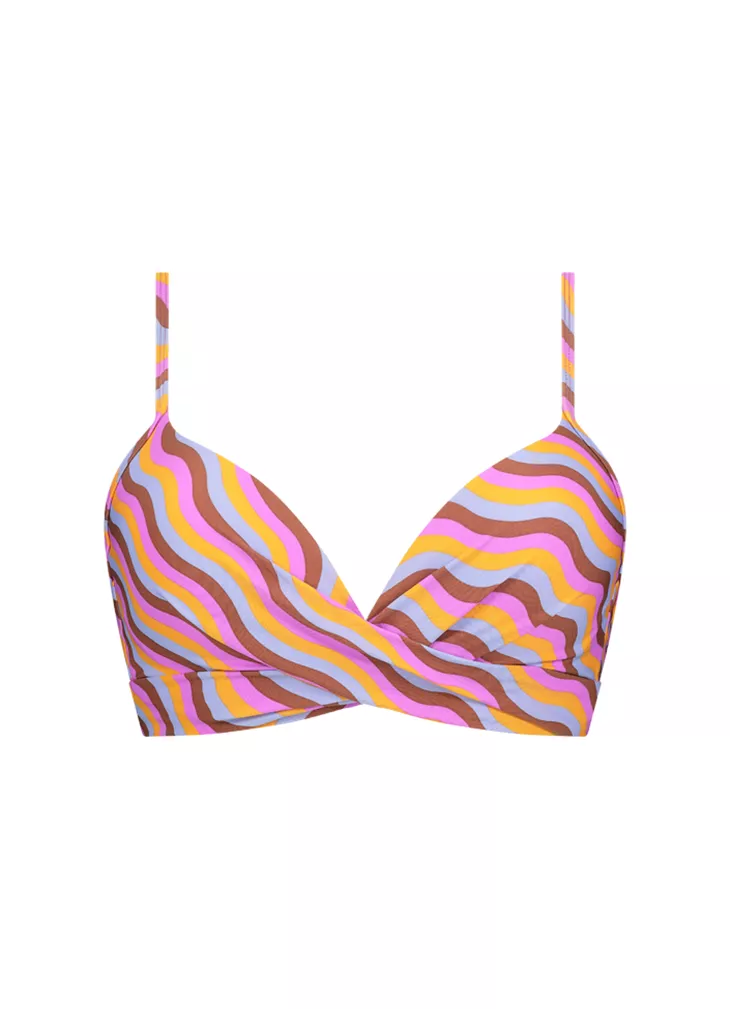 Details: De The Wave heartshape bikinitop van Beachlife is uitgevoerd in een prachtige kleurenmix van oranje en paars. Een super leuke print, waar je gelijk vrolijk van wordt. De voorgevormde cups van deze bikinitop geven de borsten een mooie ronde vorm en een natuurlijke lift. Doordat de cups hoger aansluiten is deze top geschikt voor vrijwel elk type borst. Daarnaast krijg je een prachtig decolleté door de mooie twist die wordt gecreëerd onder de cups. Combineer met één van de bijpassende broekjes van deze The Wave serie en je hebt een super leuke set!