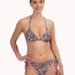 De Cheetah Chic halter bikini top van Cyell is uitgevoerd in een opvallende dierenprint met de kleur bruin als basis. Dit model heeft comfortabele triangle cups die zorgen voor een natuurlijke vorming van de buste. Je strikt de top eenvoudig in de nek en op de rug, waardoor je de pasvorm volledig naar wens aanpast. De uiteinden van de koordjes zijn verrijkt met subtiele zilverkleurige bedels voor een verfijnde afwerking. Tussen de cups bevindt zich een decoratief detail dat de cups met elkaar verbindt. Deze bikini top biedt de gewenste ondersteuning en een zomerse uitstraling.
