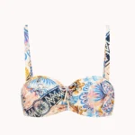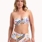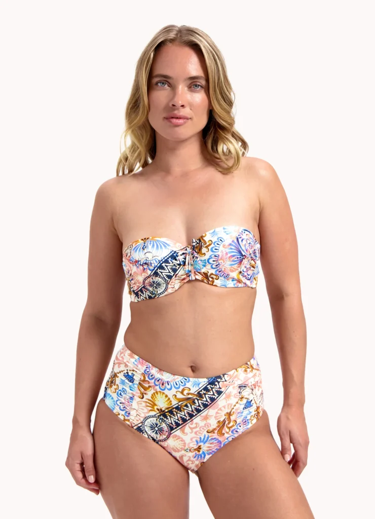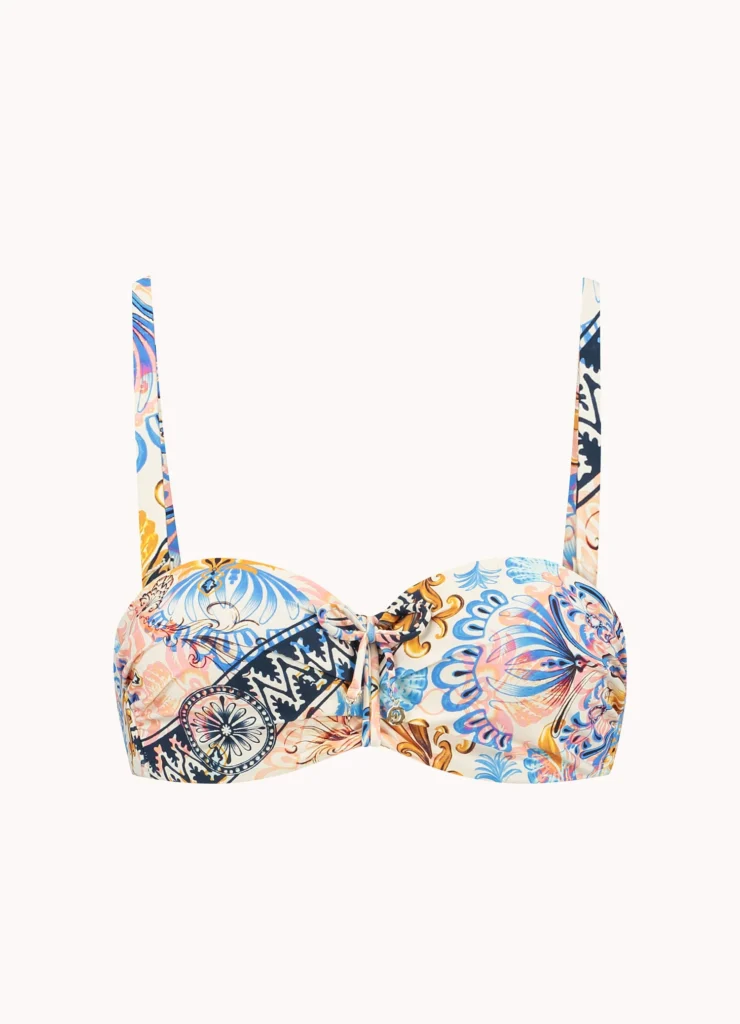 Details: De Classic fushion bandeau bikinitop van Cyell heeft een mooie kleurenmix in verschillende prints! Oranje, bruin en verschillende kleuren blauw zijn allemaal in deze bikini verwerkt. De voorgevormde cups van deze bikinitop geven de borsten een mooie ronde vorm en een natuurlijke lift. Leuk detail is het strikbandje tussen de cups. Combineer met één van de bijpassende broekjes uit deze Classic fushion serie. Vergeet de bijpassende wikkelrok niet. en ook super leuk te combineren met de Wavy blue tuniek.