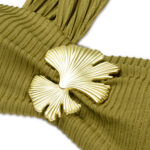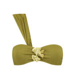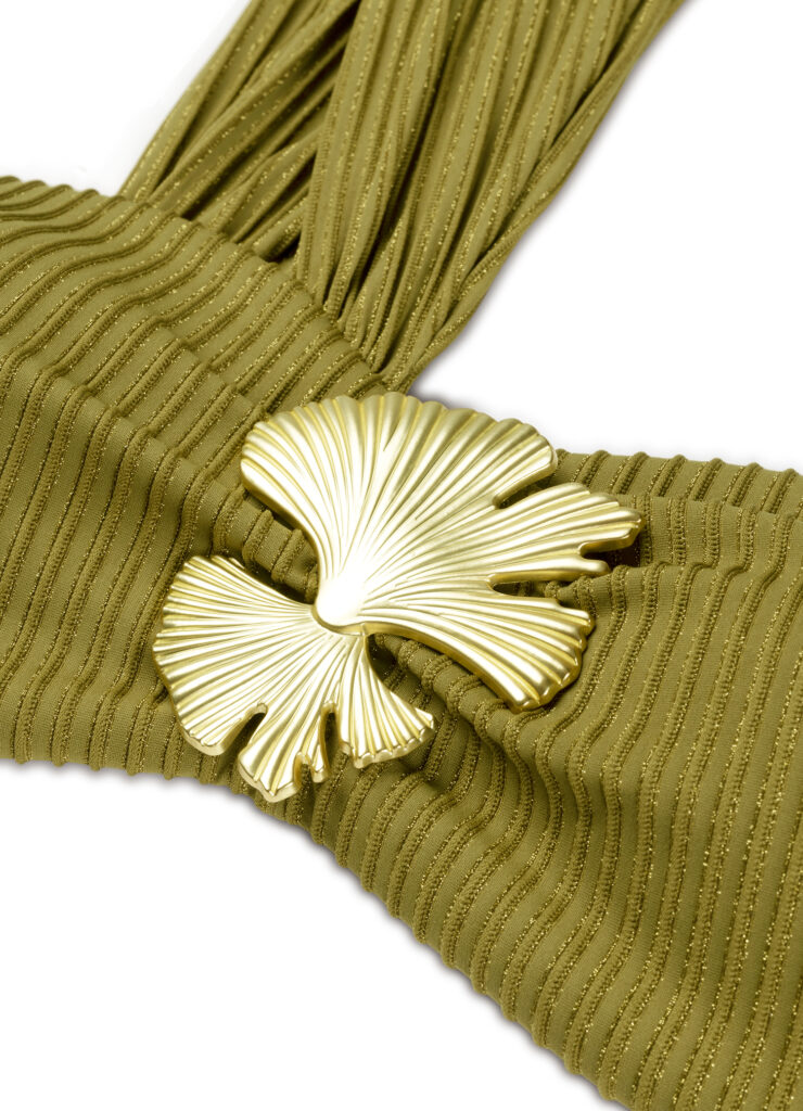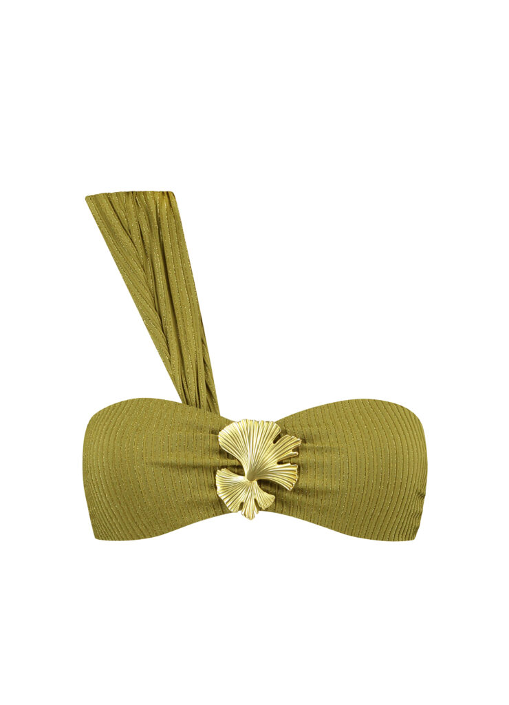 Details: Deze waanzinnige top uit de Chic Verde Cyell Design collectie is olijfgroen. Gemaakt in een ribstructuur met zachte gouden lurex draad met prachtige gouden sierdetail bloem. Top is gemaakt van een stevig maar zachte stof en voelt heel soepel maar sterk aan. Geeft een prachtig silouet met de brede band aan 1 kant.