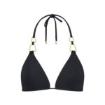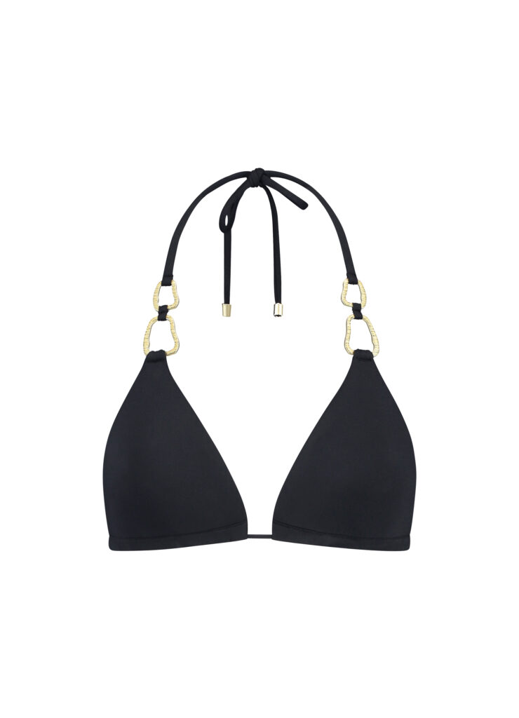 Details: Deze prachtige Femme Noir triangel bikini top van de nieuwe Cyell Design collectie is zwart. De top heeft een stevig strikbandje dat onder de cup doorloopt en voor extra stevigheid zorgt. Door de lage uitsnede krijg je een prachtig decolleté. Je kan de cups zelf stellen. Verder uit elkaar voor minder bedekking of juist wat verder naar elkaar toe voor minder decolleté. Door de striksluiting op de rug en in de nek ( met prachtige gouden details) is deze top gemakkelijk op maat te stellen. Soms zegt zwart meer dan duizend kleuren. Femme Noir is een ode aan tijdloze klasse. Diepe zwarte tinten worden gecombineerd met gouden accenten en verfijnde afwerkingen, voor een elegante en verleidelijke uitstraling. De badpakken en bikini’s zijn stijlvol en flatterend, met hoge beenuitsnijdingen en ondersteunende tops – perfect voor een krachtige, vrouwelijke look. Combineer de Femme Noir bikini met de bijpassende zwarte pareo of beach accessoire voor een chique uitstraling.