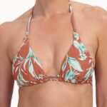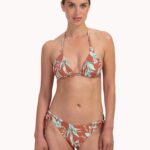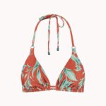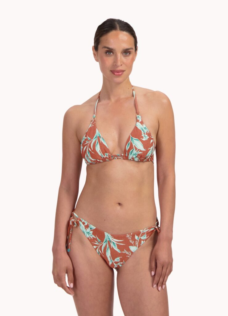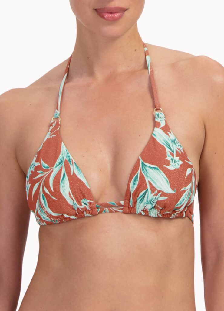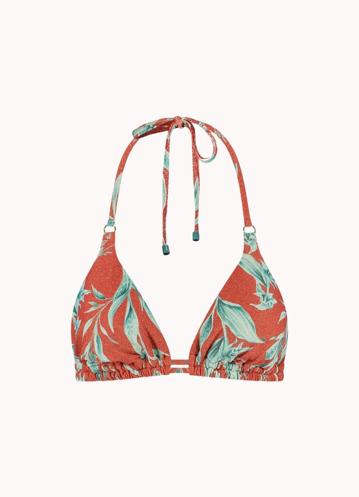 De Cyell RUSTY ROSE halter bikini top heeft een warme roestkleur die neigt naar rood, verrijkt met een contrasterend bladerdessin in frisse tinten. Deze bikini top is gemaakt van badmode met glitter weving in de stofstructuur. Het triangel model beschikt over een striksluiting in de nek en op de rug, waardoor jij de pasvorm naar wens aanpast. De koordjes zijn afgewerkt met decoratieve kralen in een bijpassende kleur.