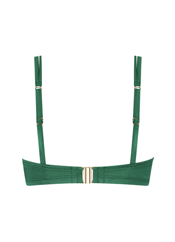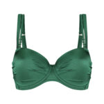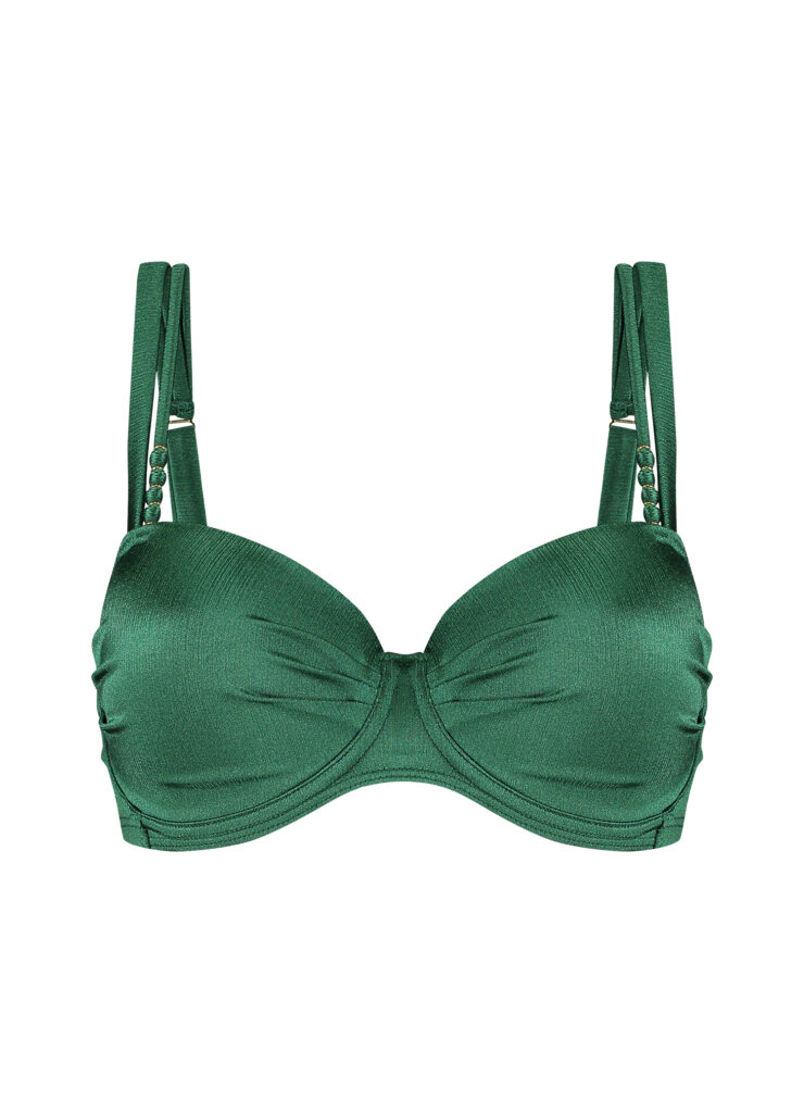 Details: De Treasure green voorgevormde bikinitop van Cyell is uitgevoerd in de kleur groen en heeft een prachtige glans! De groene kleur met een structuur streepjes motief geeft een super vrouwelijke touch! De bikinitop geeft een goede ondersteuning en geeft de borsten een mooie ronde vorm. De schouderbandjes zijn recht en kruislings te dragen. Leuk detail is het dubbele schouderbandje met kralen. Combineer met één van de bijpassende broekjes uit deze Treasure green collectie en je hebt een super leuke set.