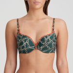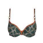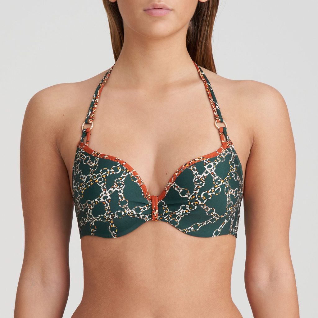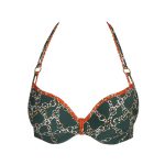Details: De Tazar hartvorm bikinitop van Marie Jo Swim is uitgevoerd in de kleur Malachite. Een mooie groene kleur, die veel huidtypes staat. De bikini is afgewerkt met bruine biesjes en heeft een all over bruin, witte kettingprint. In het kettingmotief is ook nog een leuk subtiel panterprintje verwerkt. De voorgevormde cups van deze bikinitop geven de borsten een mooie ronde vorm en een natuurlijke lift. Doordat de cups hoger aansluiten is deze top geschikt voor vrijwel elk type borst. Leuk details zijn het dubbele schouderbandje en de gouden sierring ( die niet warm word in de zon) boven de cups. Combineer met de leuke Kimono en je hebt een super leuke setje!